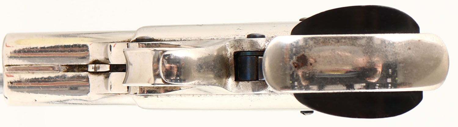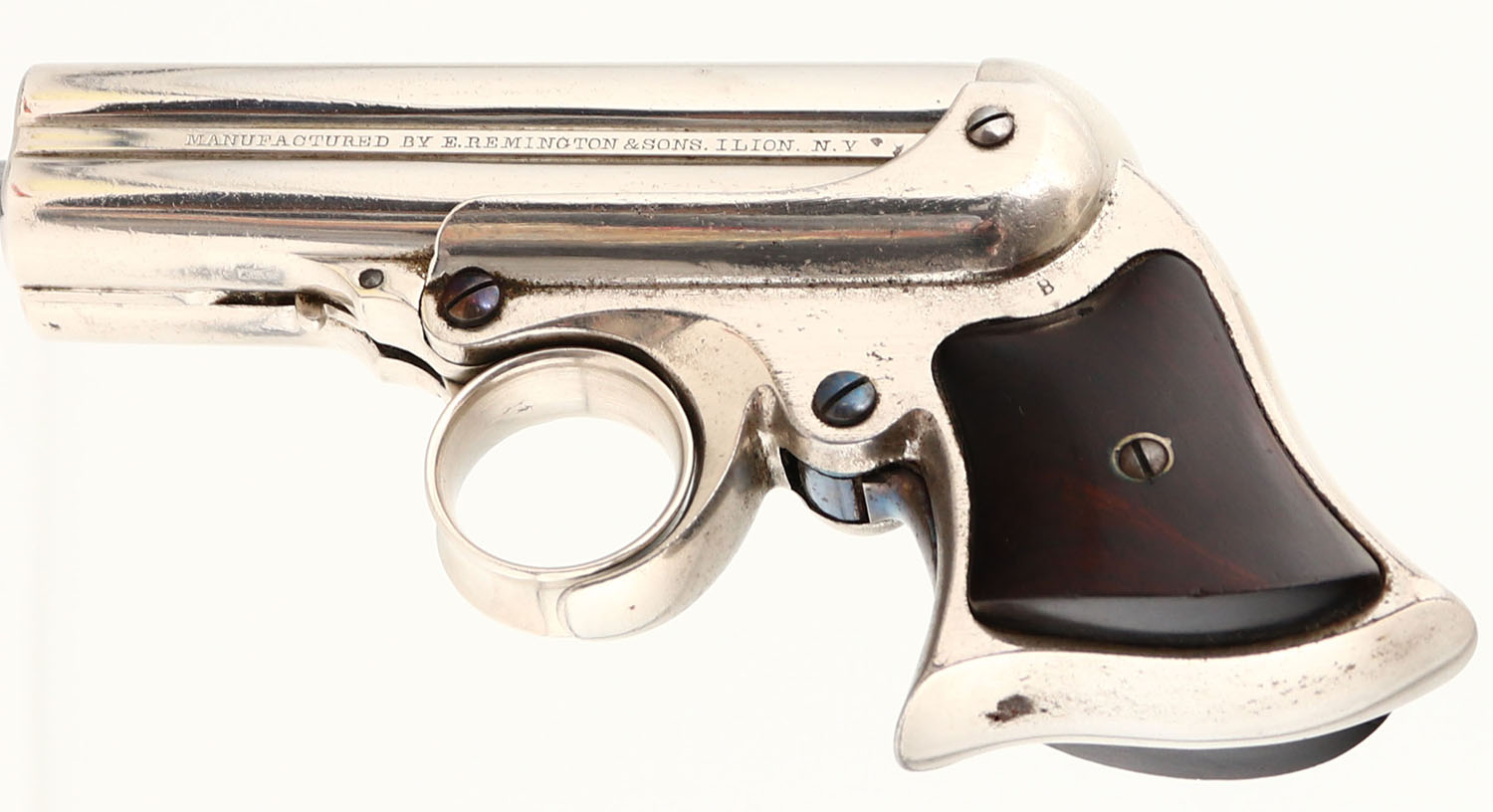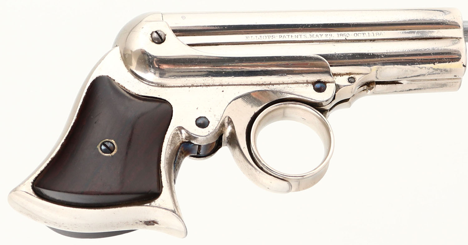 EXCELLENT, E. Remington & Sons, Elliot's 4-Shot Ring Trigger Derringer, CAL: 32 RF, MFG: 1863-88, SN: 15157, 3 3/8'' barrel. The left side of the barrel cluster is marked ''MANUFACTURED BY E. REMINGTON & SONS ILION, N.Y.'' & the right side is marked ''ELLIOTS' PATENTS MAY 29, 1860-OCT 1, 1861''. The last number one is barely legible. The frame is marked ''B'' above the left grip. The walnut grips are excellent, with minor handling marks & thinning finish. The original nickel finish rates 90% overall, with consistent spotting throughout & some areas of spotting toned to a thin brown patina. All bores are fair. They are dark & rough, with intermittent pitting. Integral notch rear sight & blade front sight. These small hideout pistols gained favor with gamblers, wealthy gentleman & lawmen. Total production estimated to be 17,500. An impressive testament to 19th century Remington quality, as it left the factory appx 150 years ago. Antique, No FFL Req. - Value: 1500 to 3000