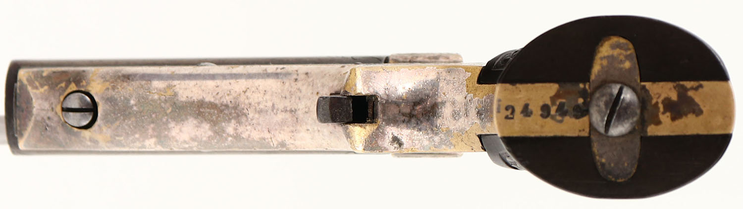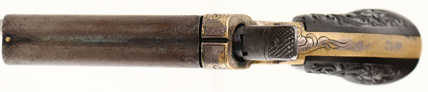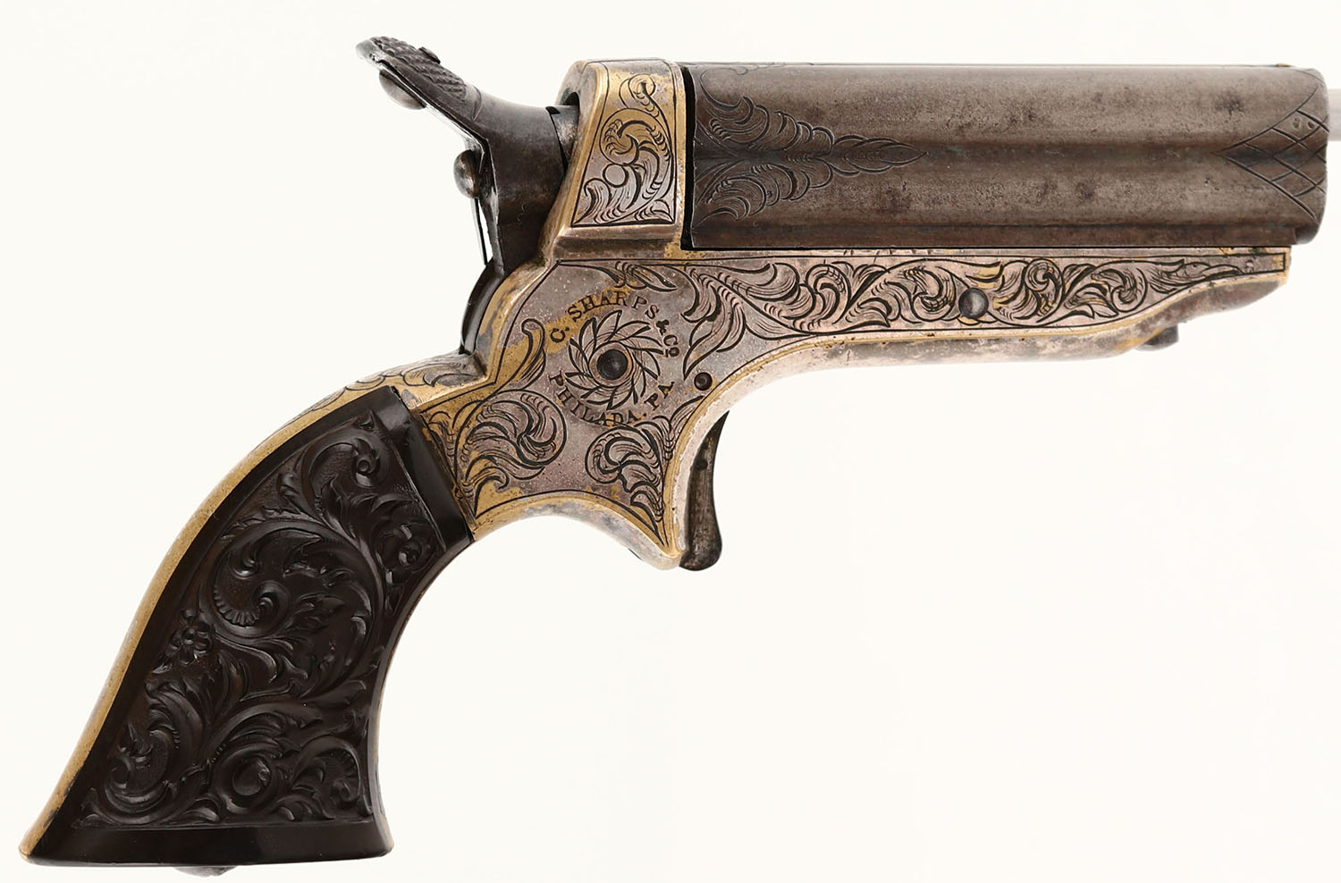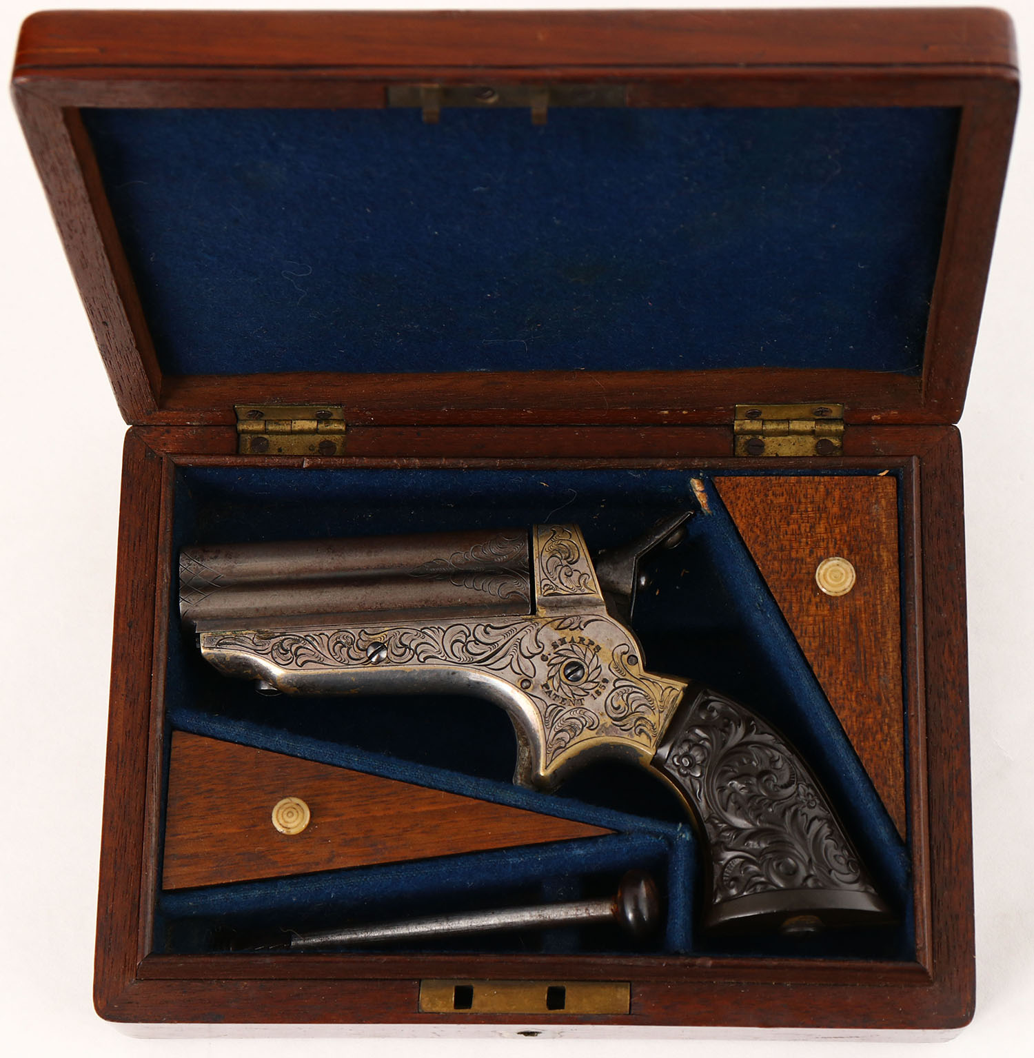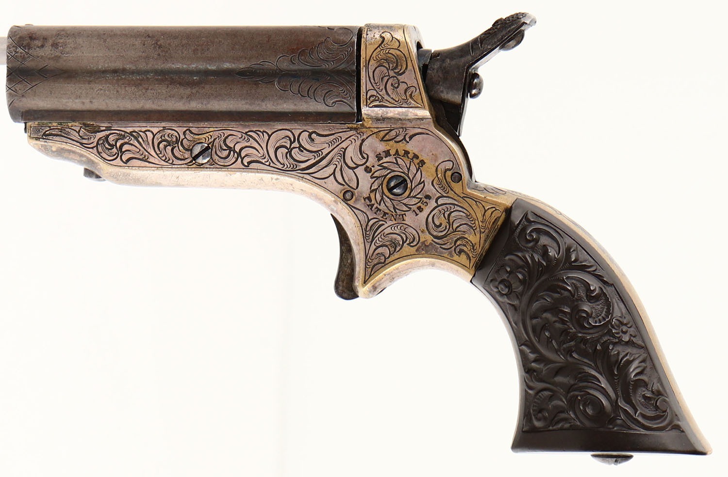 RARE FACTORY ENGRAVED, Sharps 4-Barrel Pepperbox, Model 1C, CAL: 22, MFG: Circa 1860's, SN: 24949, Derringer Revolver, 2 1/2'' barrels. The Gutta Percha carved grips are excellent. The metal blue finish on the barrels has worn to a mix of metal gray & brown patina, with remnants of blue remaining in the barrel creases. The silver nickel finish on the engraved brass frame rates 40% overall, with handling areas worn to brass. Bores are very good, with intermittent pitting amongst strong rifling. Worn bead front sight. Comes in a custom wood case, with cleaning rod. Hammer spring appears to be non-functional. Sharps produced variants of the Model 1. The 1C was the second most produced variant of the Model 1, with appx 26,000 manufactured. The Model 1A was only variation that exceeded production of the 1C, with 60,000 manufactured in the .22 caliber product line. A desirable factory engraved Derringer pistol. Antique, No FFL Req. - Value: 3000 to 5000