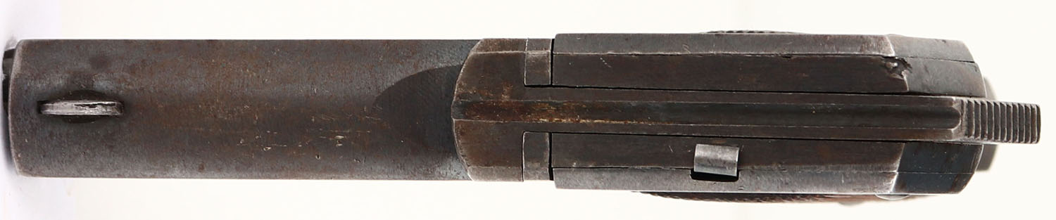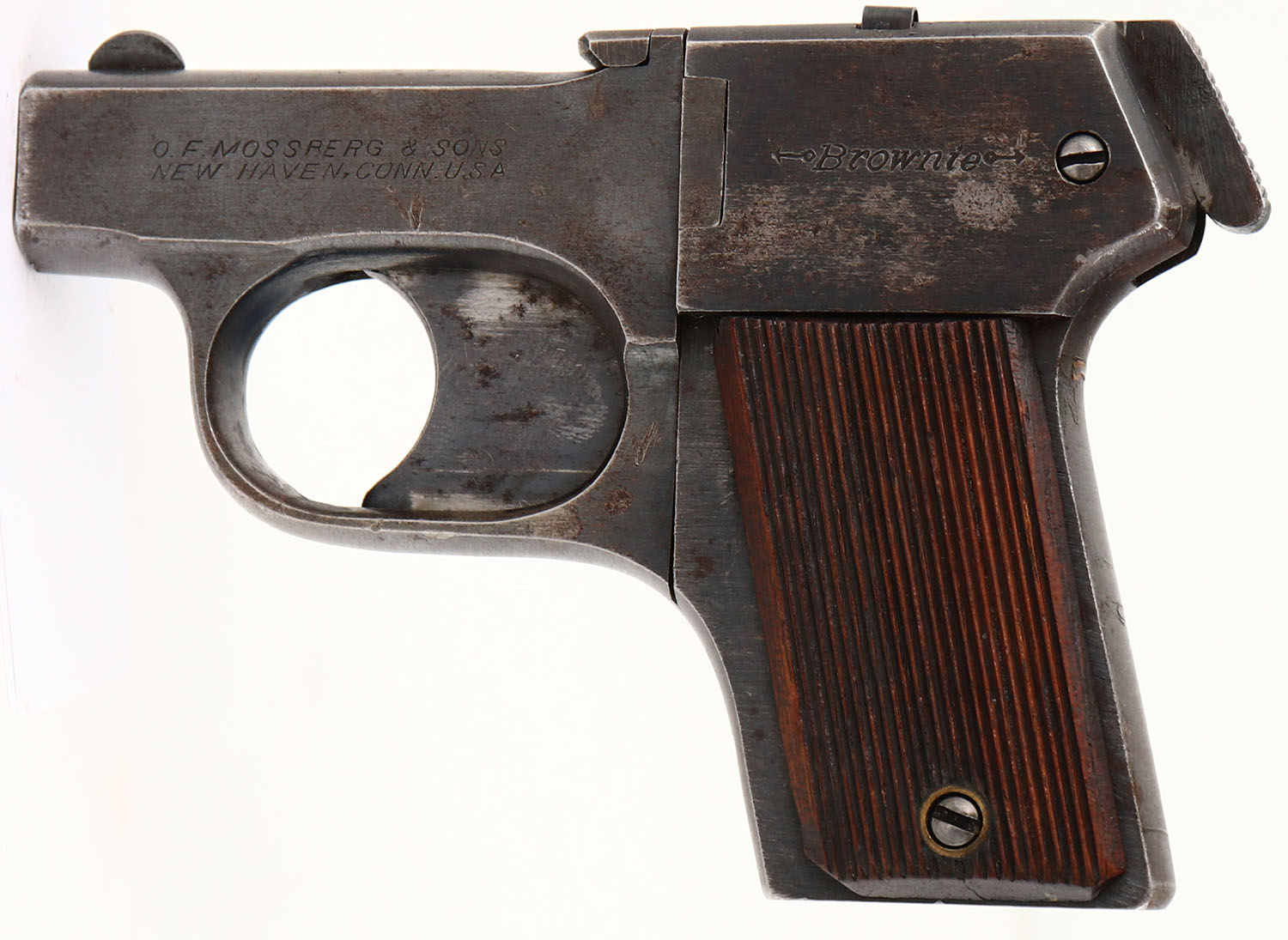 O.F Mossberg & Sons, Brownie, CAL: .22 LR, MFG: 1920-32, SN: 20180, 4-Barrel Pepperbox Pistol, 2 1/2'' barrel. The grooved wood grips are excellent. There are minor handling marks. The metal blue finish rates 40% overall, with areas toned to a brown patina & worn to metal gray. Bores are good, with intermittent roughness & pitting. Blade front sight. Mossberg provided a piece of bent sheet metal to extract the spent cartridges. That piece is present. This pistol was produced as double action, with a counter-clockwise rotating firing pin. The firing pin rotates to all four positions. This was Mossberg's first production pistol, selling just over 30,000. FFL or C&R Req. - Value: 200 to 600