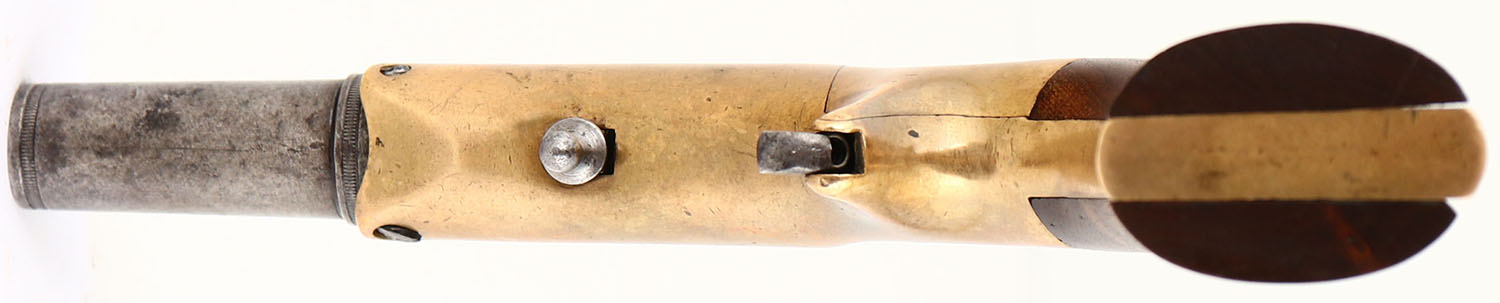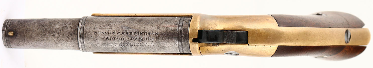 RARE, Wesson & Harrington, Derringer Pistol, CAL: 22RF, MFG: circa 1859, SN: 37, Single Shot Tip-Up Pistol, 3'' step down barrel. This is a very rare little pistol, made during the approximate six-month business relationship between Frank Wesson & Nathan Harrington. It is to be said that appx. 100 were produced in that short span. The top of the barrel is marked in three lines ''WESSON & HARRINGTON'', ''WORCESTER MASS.'', ''PATENT APPLIED FOR'', which is different than later examples with the 1859 patent date. The two-piece wood grips are excellent, with minor scrapes & handling marks. The metal blue finish on the barrel has worn to a mix of metal gray & brown patina. The brass frame has an attractive aged patina, with minor blemishes. Bore is good & bright with intermittent pitting. Small brass bead front sight. A nice example of a desirable antique American pistol. Antique, No FFL Req. - Value: 1000 to 4000