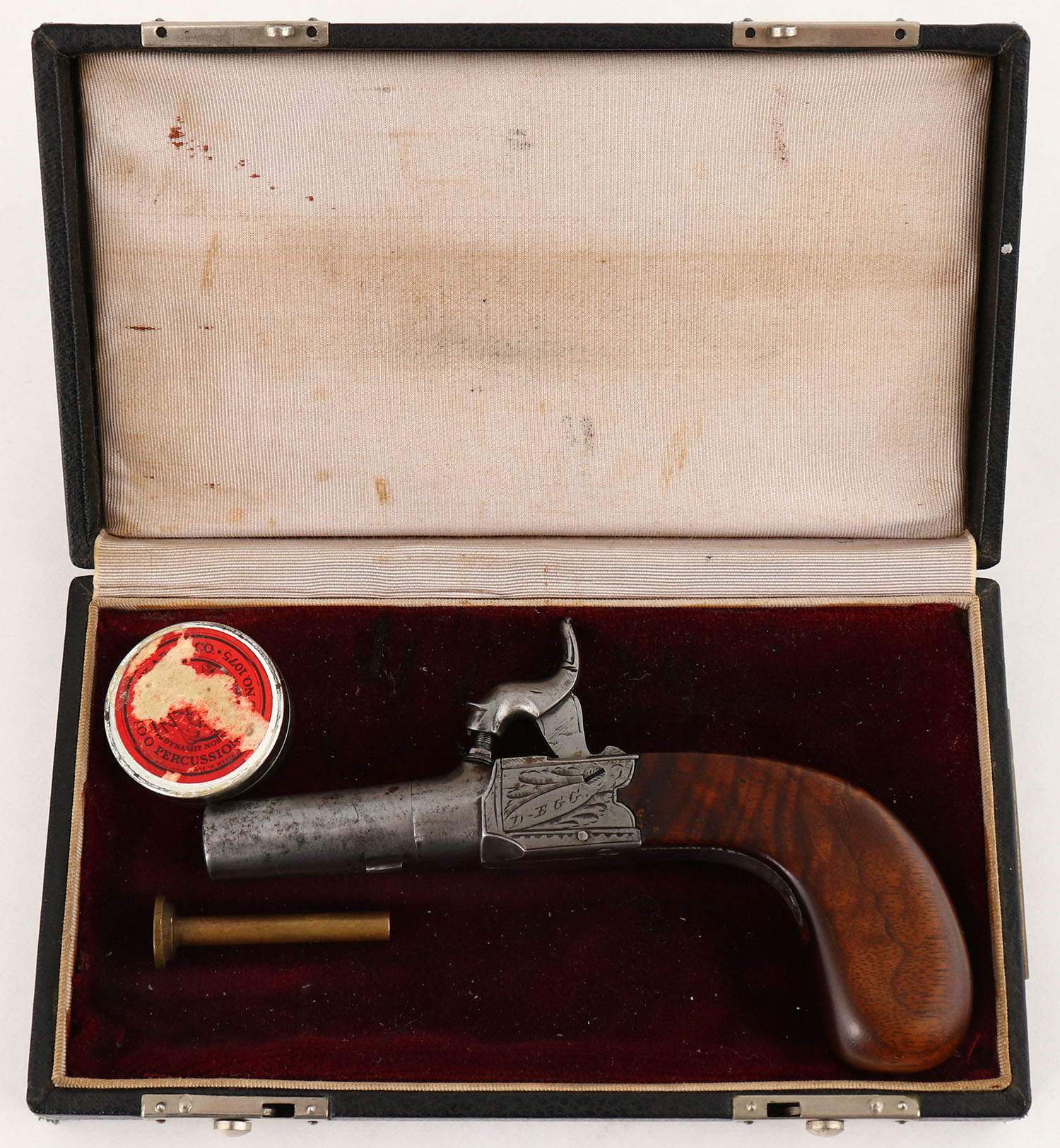 Durs Egg, Pocket Pistol, CAL: 45, MFG: Mid 1800's, SN: NONE, Percussion Single Shot Pistol, 1 1/2'' screw-on barrel. The left side of the frame is marked ''D.EGG'' & the right side is marked ''LONDON''. Proof marks on the bottom of the barrel & frame. The markings are accompanied by simple decorative engraving. The wood grips are excellent, having been lightly sanded & refinished. The metal is left ''in the white'', with areas of spotting & pitting toned to a brown patina. Bore is very good, with intermittent light pitting. No sights. Comes in a black leatherette case, with ramrod & percussions caps. Trigger folds down from inside the frame when the hammer is cocked. It can manually be folded back up into the frame. From further research, D.Egg manufactured guns from appx. 1775-1837. Antique, No FFL Req - Value: 300 to 600