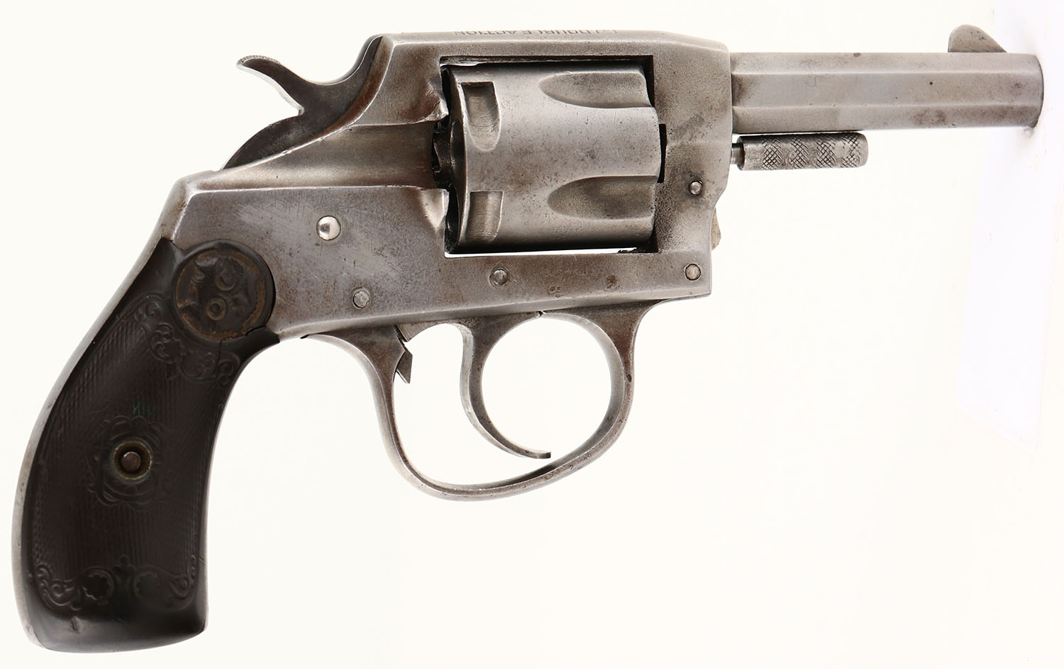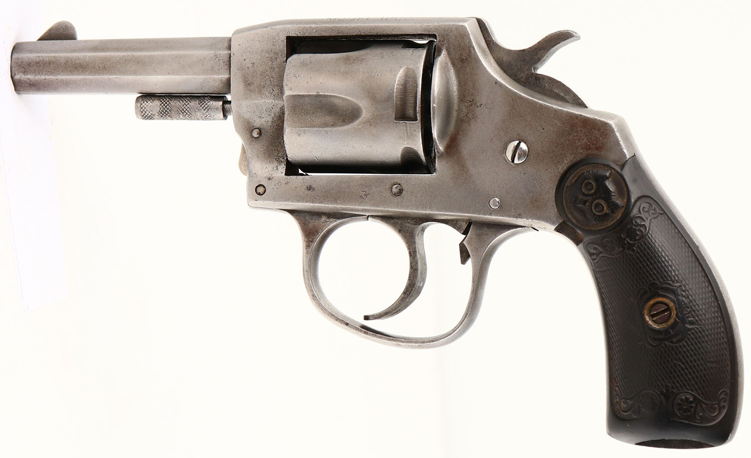 Iver Johnson, Model 1900, CAL: 32RF, MFG: 1900-41, SN: 20459, Double Action Revolver, 2 1/2'' barrel. The IJ owl head checkered hard rubber grips are fair & solid. The left grip has a edge chip at the butt, a smaller one at the top of the front strap, a small crack on the top of the right grip, along with smooth checkering & other minor blemishes. The revolver is entirely metal gray, with no remnants of finish & intermittent cleaned pitting. Bore is poor, dark & rough, with consistent pitting. Integral notch rear sight & blade front sight. FFL or C&R Req. - Value: 40 to 80