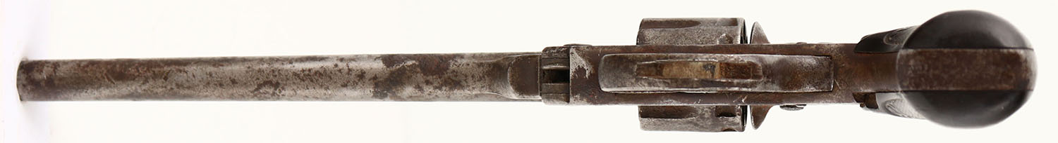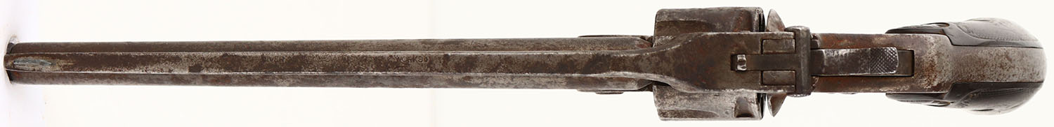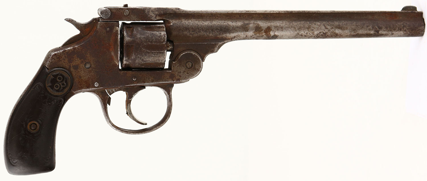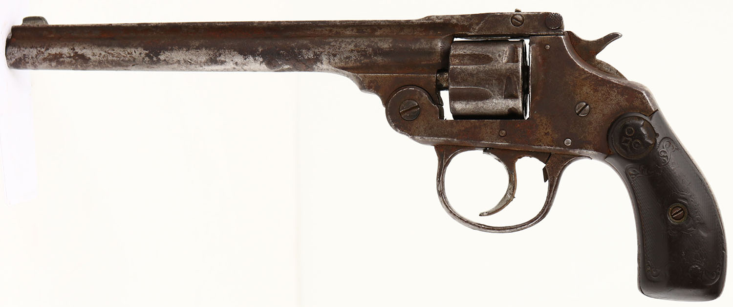 Iver Johnson, Model 1900?, CAL: 22, MFG: 1925-28, SN: 26802, Double Action Revolver, 6'' barrel. The IJ owl head grips are fair. There is a small edge chip on the upper front corner of the right grip, along with smooth checkering, contusions & scrapes. The metal finish has fully worn to gun metal gray & toned to a brown patina, with a fair amount of standing rust. Bore is fair, consistently rough with pitting. Notch rear sight & blade front sight. Multiple issues with mechanical operation. Needs to be inspected by a licensed gunsmith before operation. SOLD AS IS- NO RETURNS. FFL or C&R Req. - Value: 40 to 80
