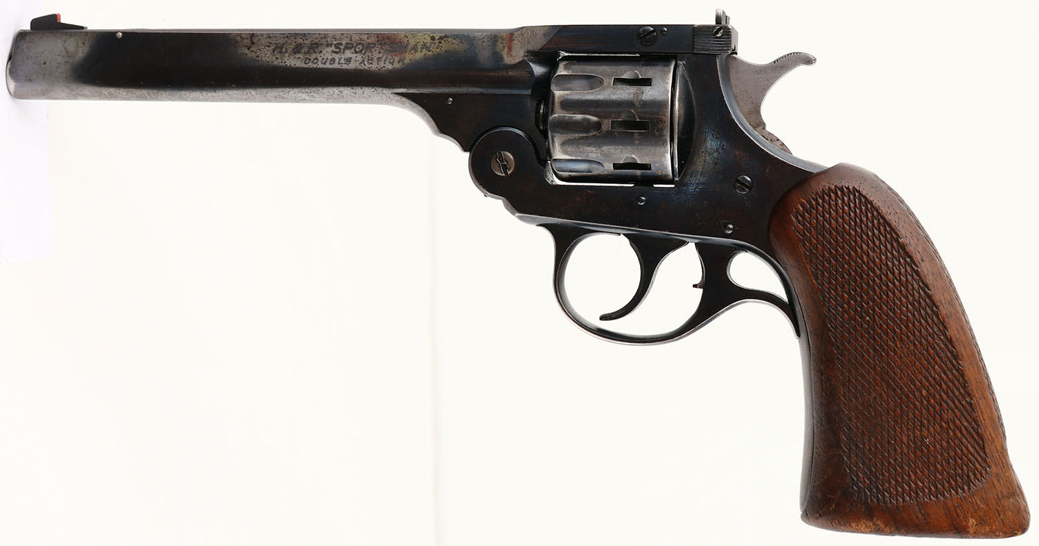 Harrington & Richardson, H&R Sportsman 999, CAL: 22LR, MFG: 1943, SN: D25137, 9 Shot Double Action Revolver, 6'' barrel. The checkered wood grips are very good & solid. There are dings, nicks & scrapes throughout. The metal blue finish on the barrel rates 80%, with consistent rust speckling & the frame rates 60%, with loss on the front strap & consistent rust speckling throughout. Bore is excellent. Adjustable rear sight & blade front sight. FFL or C&R Req. - Value: 200 to 400