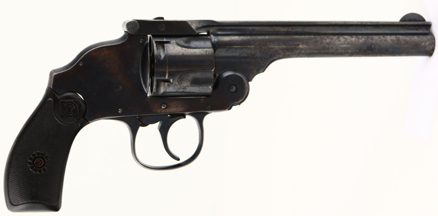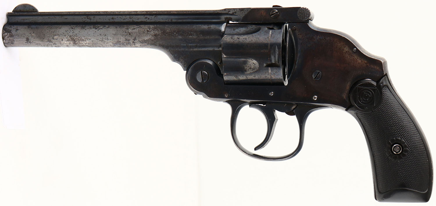 Harrington & Richardson, Top Break Automatic Ejecting Model 3 - Third Variation, CAL: 38 S&W, MFG: 1905-40, SN: 151206, Double Action Revolver, 5'' barrel. The Target logo checkered hard rubber grips are excellent. There are minor dings & scrapes. The metal blue finish on the barrel rates 50-60%, & 70% on the frame, with consistent spotting throughout, toned to a brown patina. Bore is excellent. Notch rear sight & blade front sight. FFL or C&R Req. - Value: 50 to 200