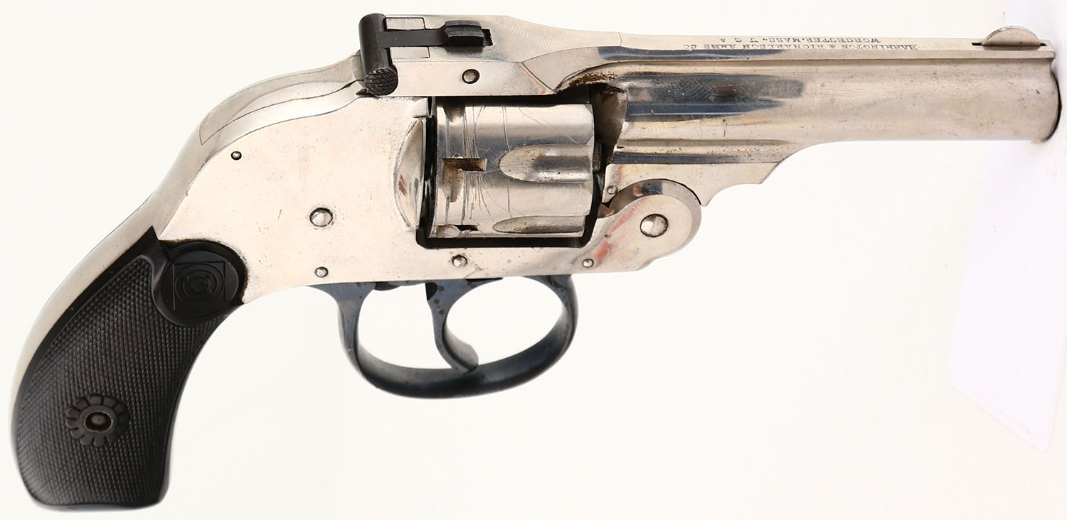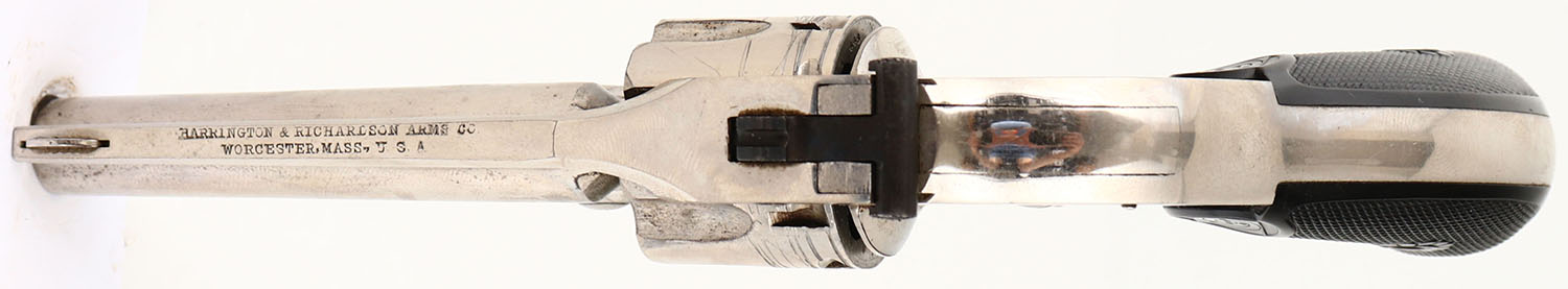Harrington & Richardson, Double Action Hammerless, CAL: 22RF, MFG: early 1900's, SN: 15448, Double Action Revolver, 3'' barrel. The Target logo checkered hard rubber grips are excellent, with minor wear. The nickel finish rates 90% overall, with thin brush lines, areas of haze light speckling. Bore is excellent, with minor roughness near the muzzle. Notch rear sight & blade front sight. FFL or C&R Req. - Value: 100 to 300