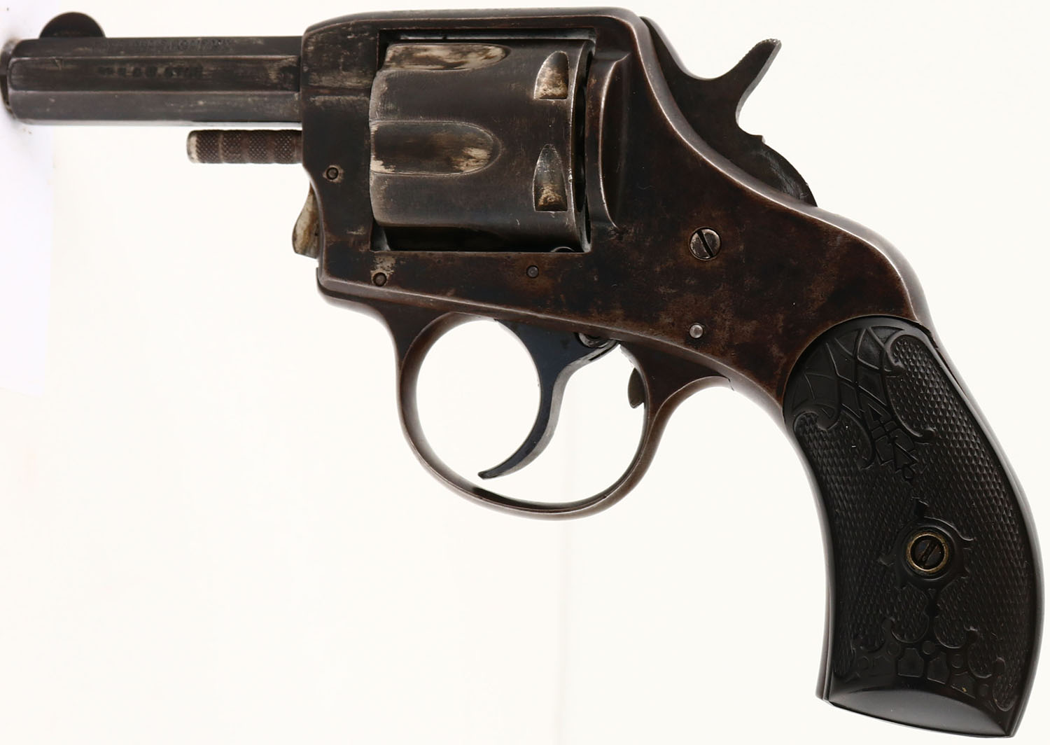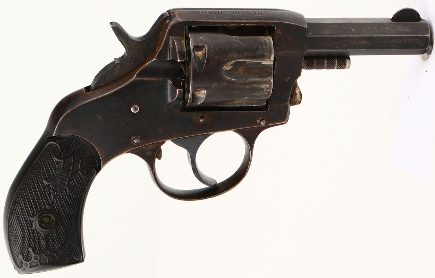 Harrington & Richardson, The American D.A 1st Model - 4th Variation, CAL: 32 S&W, MFG: 1898-1904, SN: 103311, Double Action Revolver, 2 1/2'' barrel. The checkered & carved hard rubber grips are excellent. The metal blue finish rates 70% on the barrel & 40% on the frame, with even wear toned to a chocolate brown patina. Bore is very good, with roughness & light pitting. Integral groove rear sight & blade front sight. FFL or C&R Req. - Value: 50 to 250