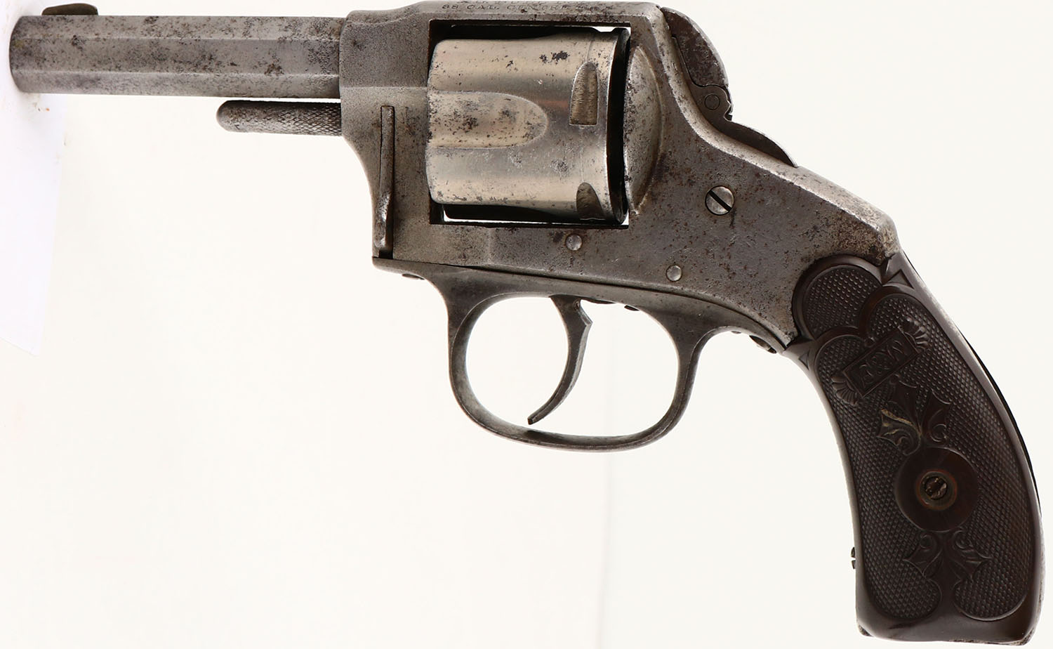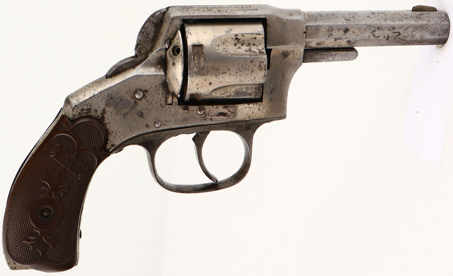 Hopkins & Allen, XL Bulldog Folding Hammer, CAL: 38 S&W, MFG: circa 1880's-90's, SN: 3180, Double Action Revolver, 3'' barrel. The F&W carved & checkered hard rubber grips are good. The bottom of both grips have a sizeable edge chip, otherwise very good. The metal finish has fully worn to gun metal gray, with consistent pitting & speckling throughout. Bore is good & bright, with roughness & pitting. Blade front sight. Loading gate swings freely. Issues with mechanical operation. Needs to be inspected by a licensed gunsmith before operation. SOLD AS IS- NO RETURNS. Antique, No FFL Req. - Value: 50 to 150