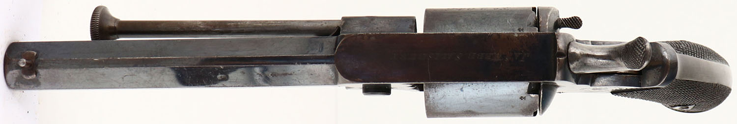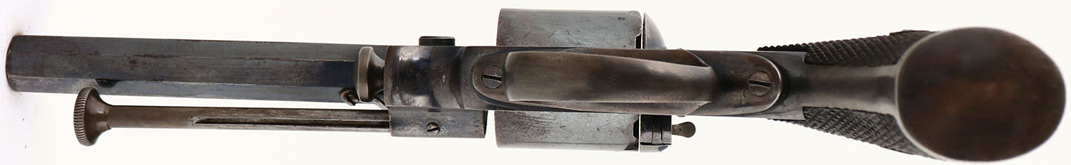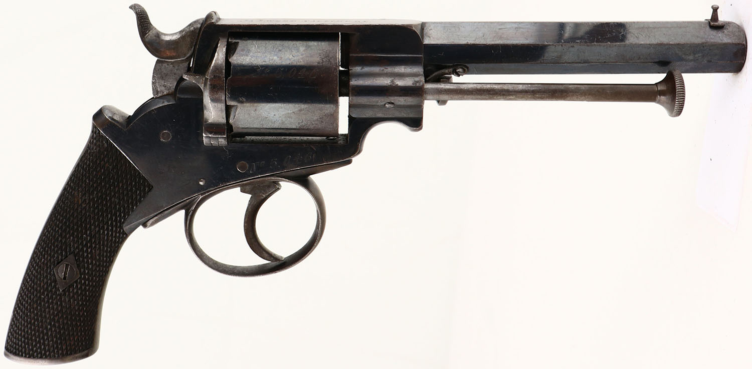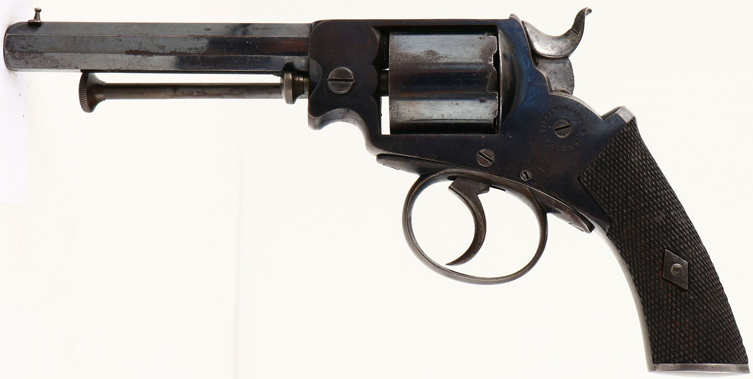 SCARCE, English Proof Tipping & Lawden Patent, Double Action Revolver, CAL: 32, MFG: circa 1860's-70's, SN: 5046, 4 7/8'' barrel. The left side of the frame is marked ''TIPPING & LAWDEN PATENT'' in a circular fashion. The top of the frame is marked ''JA S WEBB. SALISBURY''. The full SN can be seen on the right side of the frame & the cylinder. Crossed swords English proofs on the left side of the barrel. The checkered wood grips are excellent. There are minor dings & scrapes to the checkering. The original bright blue metal finish rates 80% on the barrel & 60% on the frame, with area worn to metal gray & toned to a brown patina. Bore is poor, dark & heavily pitted. Small V-notch rear sight & post front sight. Antique, No FFL Req. - Value: 1000 to 2000
