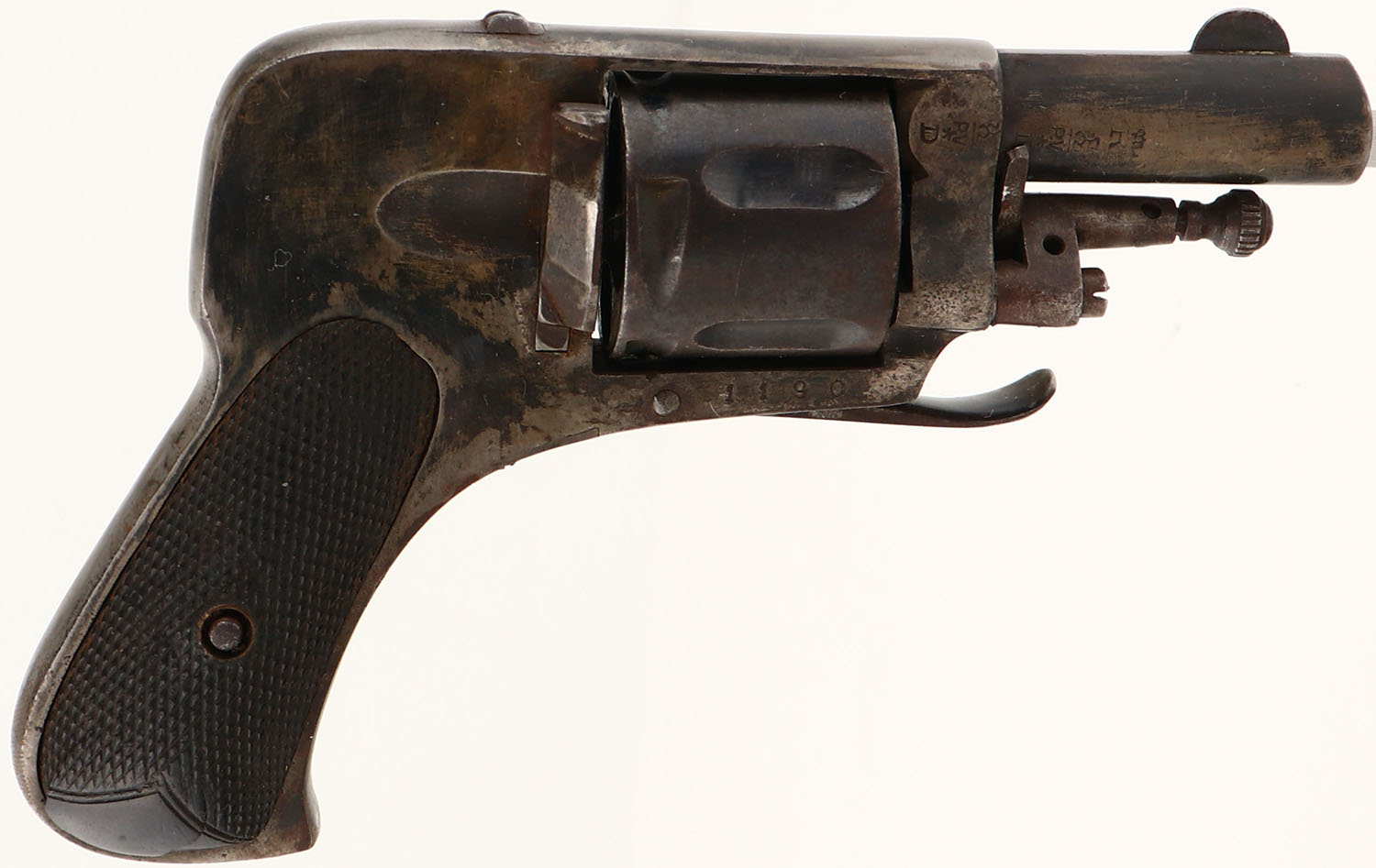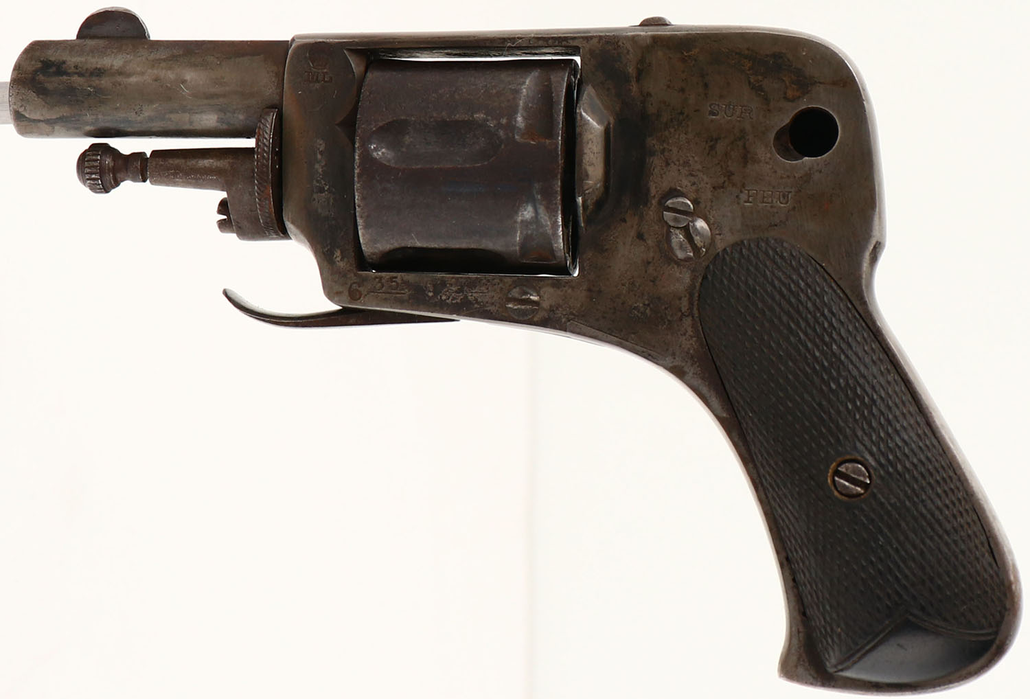Belgian, Velo-Dog Copy, CAL: .25 ACP (6.35), MFG: 1898-1930's, SN: 1190, Double Action Revolver, 1 3/4'' barrel. The checkered hard rubber grips are good & solid. The bottom of the right grip has a crack, along with other scrapes & dings. The metal finish has worn to a mix of blue finish, metal gray & brown patina. Bore is good, with roughness & light pitting. Small notch rear sight & blade front sight. Missing safety lever. Today, the Velo-Dog term is used for a broad assortment of European & American pocket revolvers by diverse, often anonymous makers. FFL or C&R Req. - Value: 50 to 150