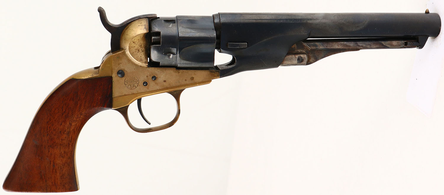 Connecticut Valley Arms, 1862 Police Revolver, CAL: .36, MFG: Modern, SN: A62543, Single Action Percussion Revolver, 5 1/2'' barrel. The metal blue finish on the barrel & cylinder rates 98%. The brass frame & trigger guard have an aged patina, with intermittent spotting. Bore is good & bright, with consistent pitting throughout. Small hammer notch rear sight (when cocked) & small brass bead front sight. Blackpowder, No FFL Req. - Value: 200 to 400
