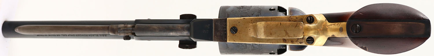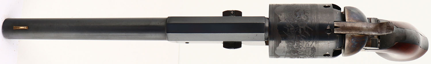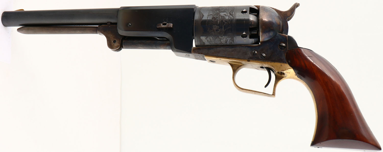 A.S.M., 1847 Walker, CAL: 44, MFG: Modern, SN: D97793, Single Action Percussion Pistol, 9'' barrel. The wood grips are very good & solid, having been repaired, light sanded & refinished. The left grip has a fill repair, along with minor handling marks & couple areas of flaking finish on the butt. The metal blue finish on the barrel & cylinder rates 95%, with chatter marks around the barrel wedge & the cylinder roll stamp is toning to a brown patina. The case-hardened frame retains nice case-colors, with areas worn to metal gray & spotting toned to a brown patina. Bore is excellent. Small hammer notch rear sight (when cocked) & small brass blade front sight. Blackpowder, No FFL Req. - Value: 300 to 500