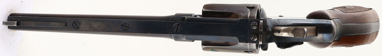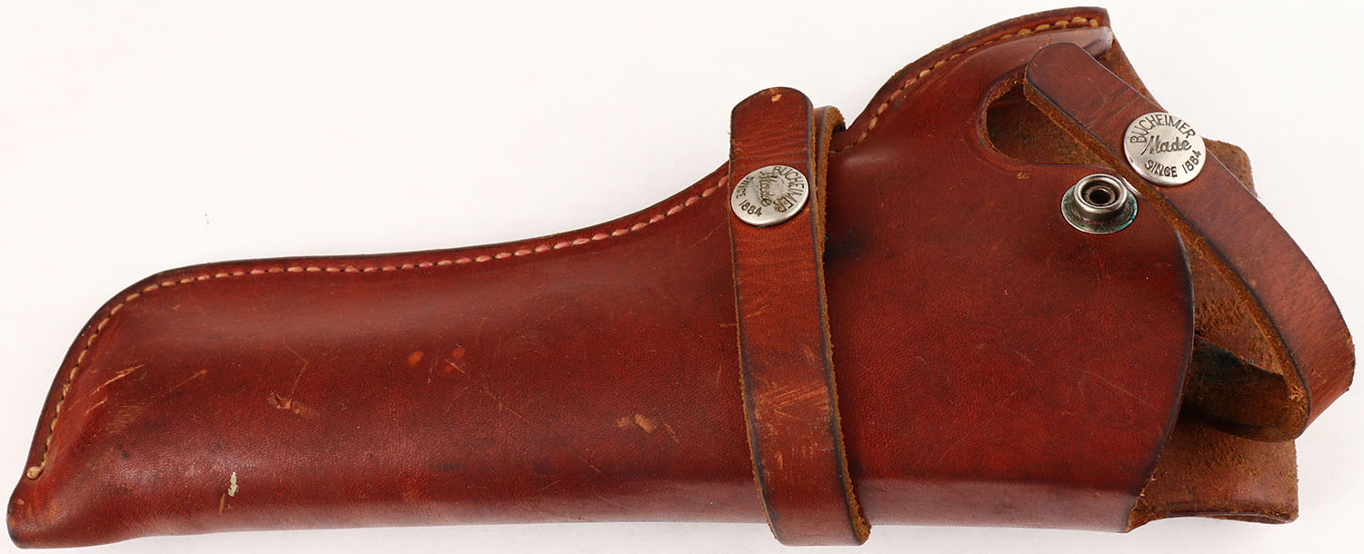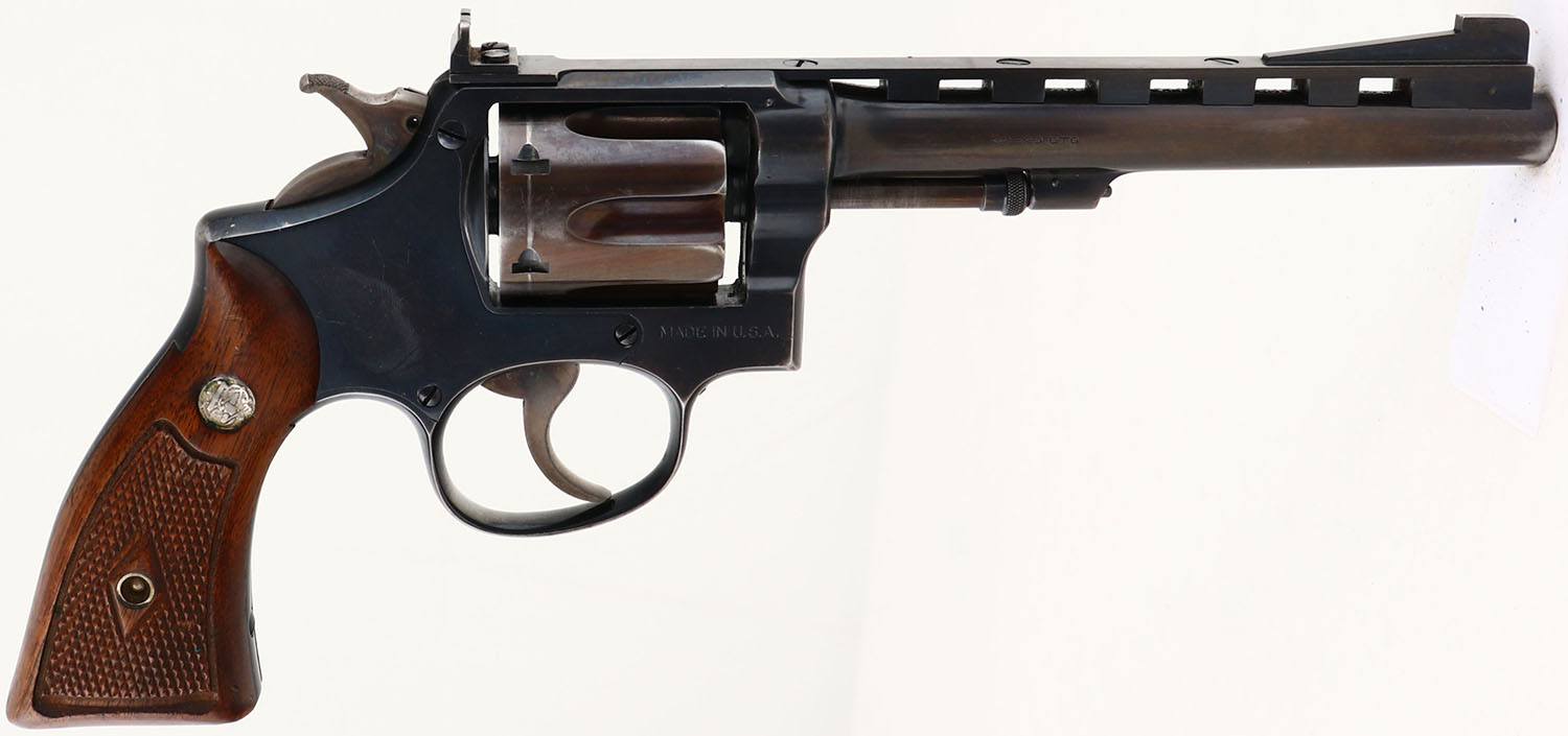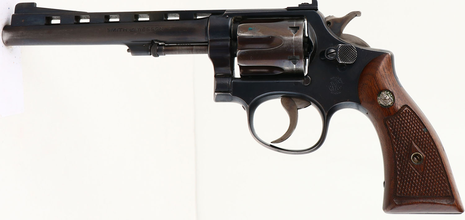 Smith & Wesson, .32-20 Hand Ejector Model of 1905 4th Change, CAL: .32-20, MFG: 1930's, SN: 132504, Double Action Revolver, 6'' barrel, with ventilated rib. The S&W logo medallion checkered wood grips are excellent. There are minor handling marks & a couple dings. The metal blue finish rates 40% on the barrel, 75% on the frame, & the cylinder has toned to a bronze patina, with areas worn to metal gray. The case-hardened trigger & hammer retain visible case-colors. Bore is excellent, but appears frosted or hazy. Replaced square notch rear sight & a ramp elevated blade front sight sits on the ventilated rib. Comes with a Bucheimer leather holster. FFL or C&R Req. - Value: 250 to 450