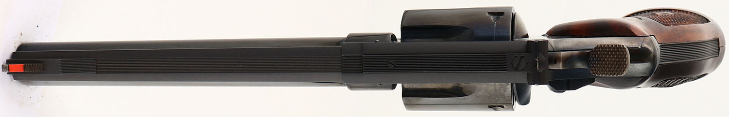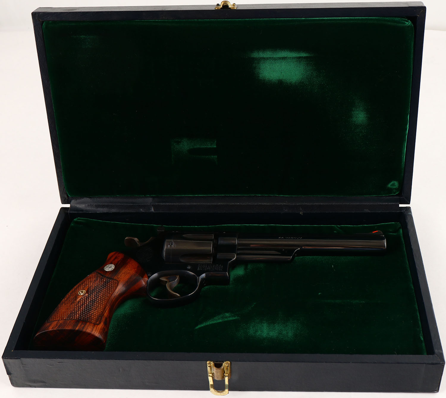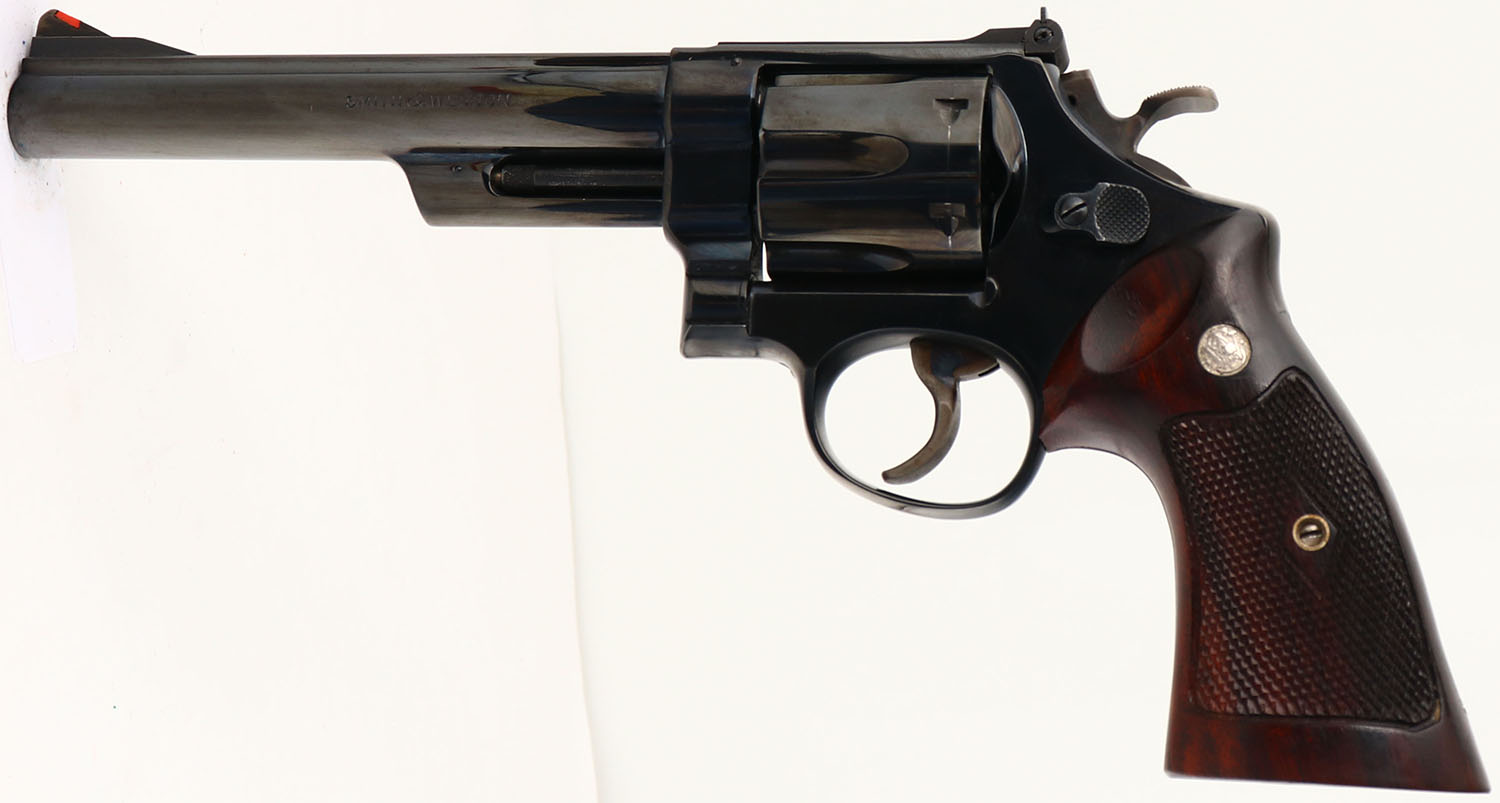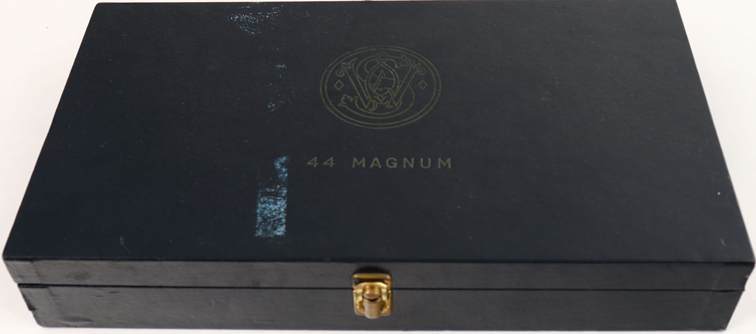 PRESENTATION CASED, Smith & Wesson, Pre-Model 29 Four Screw, CAL: .44 MAG, MFG: 1957, SN: S172134, Double Action Revolver, 6 1/2'' barrel. The S&W logo medallion ''Coke Bottle'' wood grips are excellent. The grips appear to have a hand applied oil finish, that has darkened the left grip overall & enhanced the darker grains in the right grip. The original metal blue finish rates 98% overall. The case-hardened trigger & hammer retain excellent case-colors. Factory adjustable micrometer click rear sight & serrated blade front sight with red insert. Bore is excellent. Comes in a rare & highly collectible dark blue pebble grain leatherette presentation case with green velvet lining, marked S&W .44 MAGNUM on the lid. This seldom seen set would be a nice addition to any S&W collection.* FFL or C&R Req. - Value: 3500 to 5500
