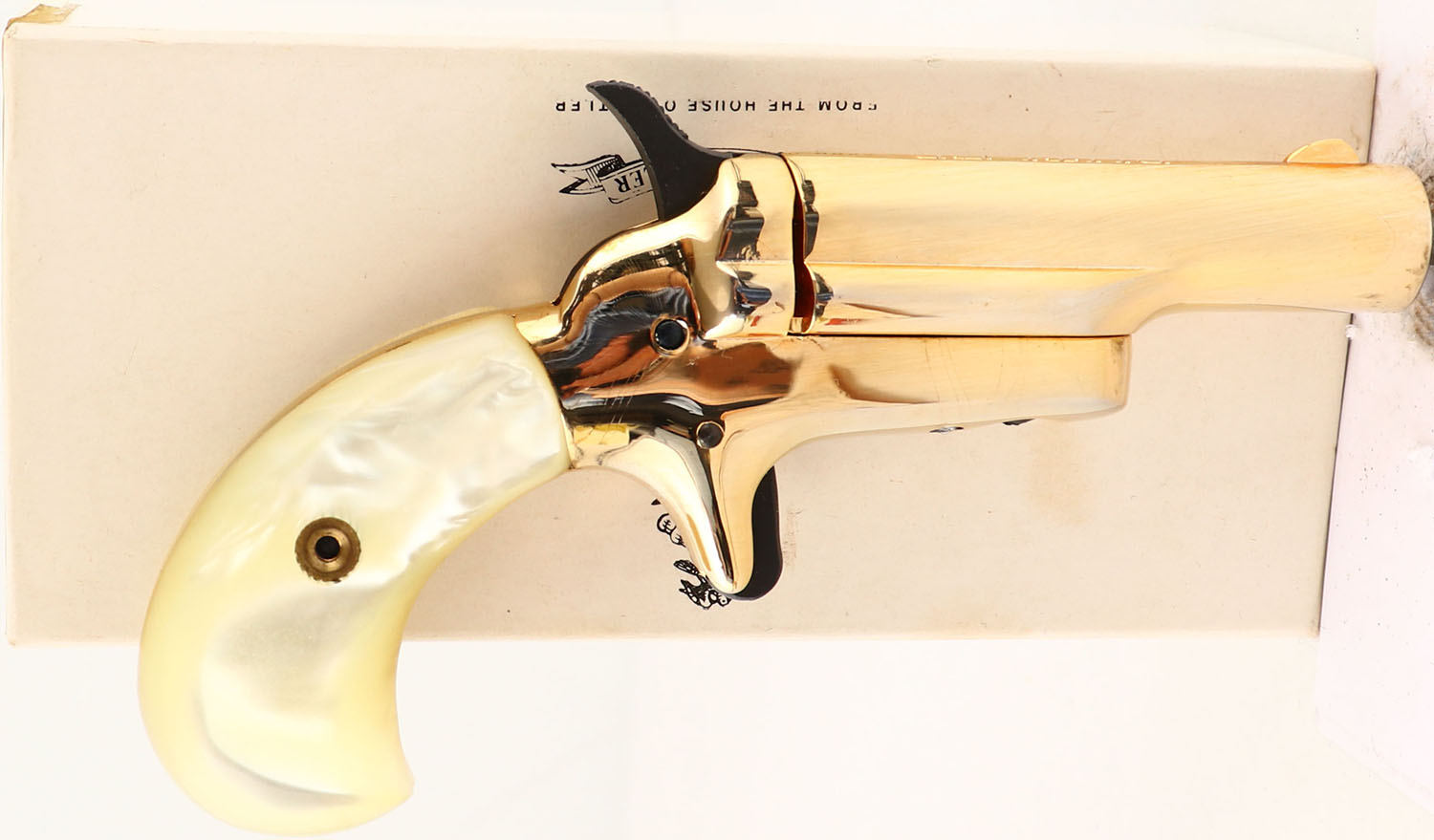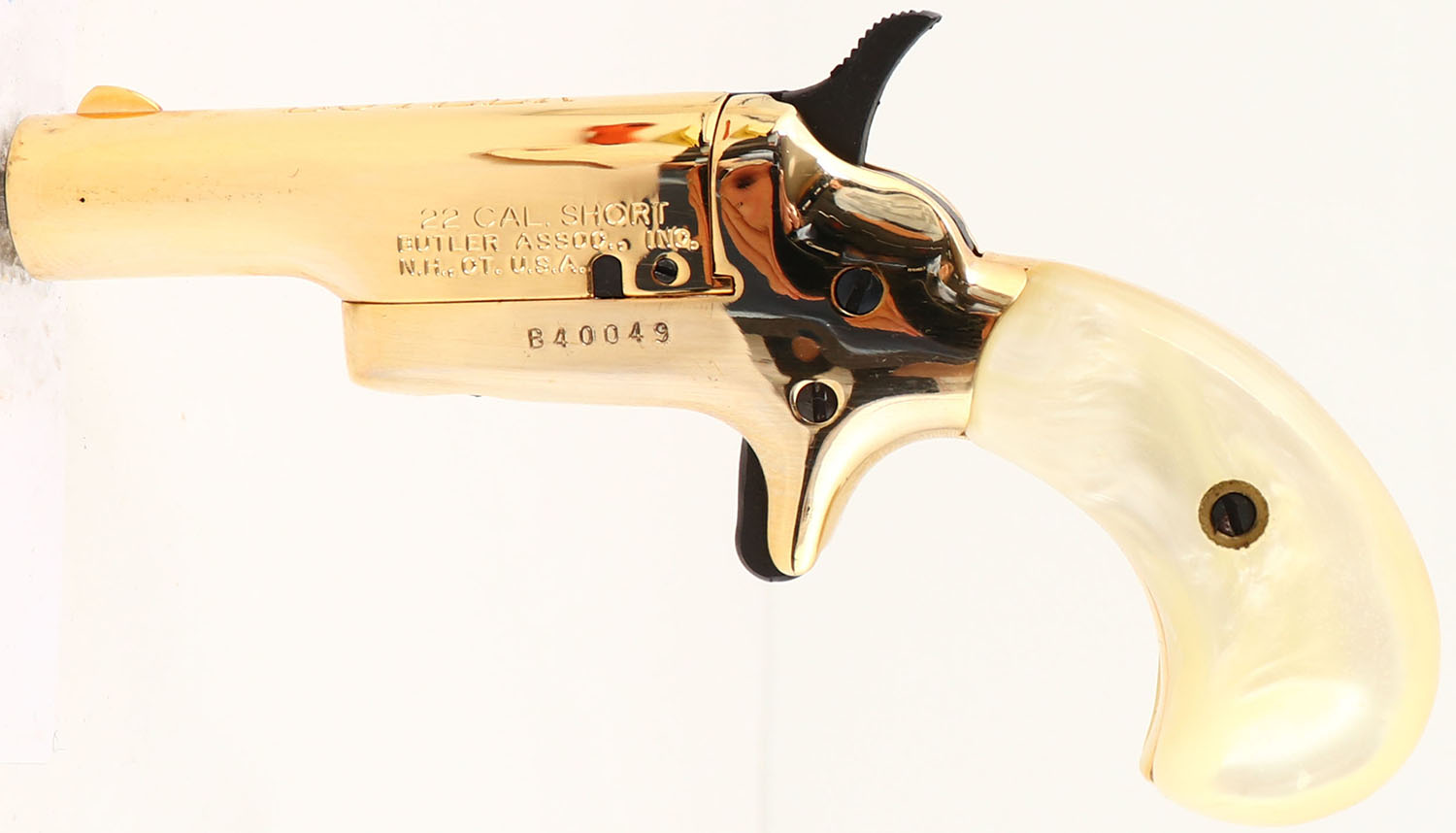 BOXED, Butler, Derringer, CAL: 22 SHORT, MFG: Modern, SN: B40049, Singler Action Pistol, 2 3/8'' barrel. The faux pearl grips are excellent. The high polish gold tone finish rates 99% overall, with minor speckling on the left side of the barrel. Bore is excellent. Blade front sight. Comes in factory box. FFL Req. - Value: 100 to 200