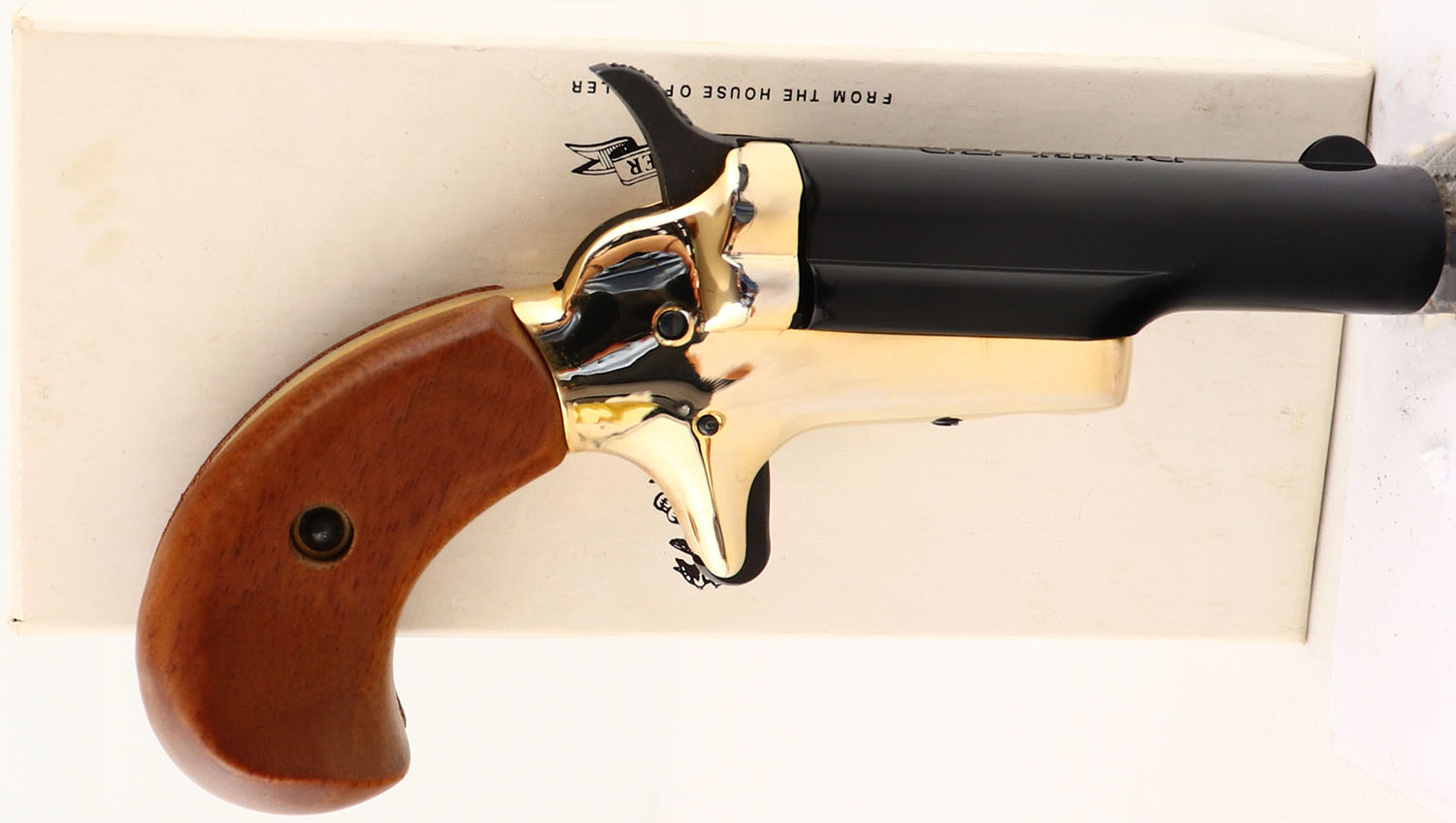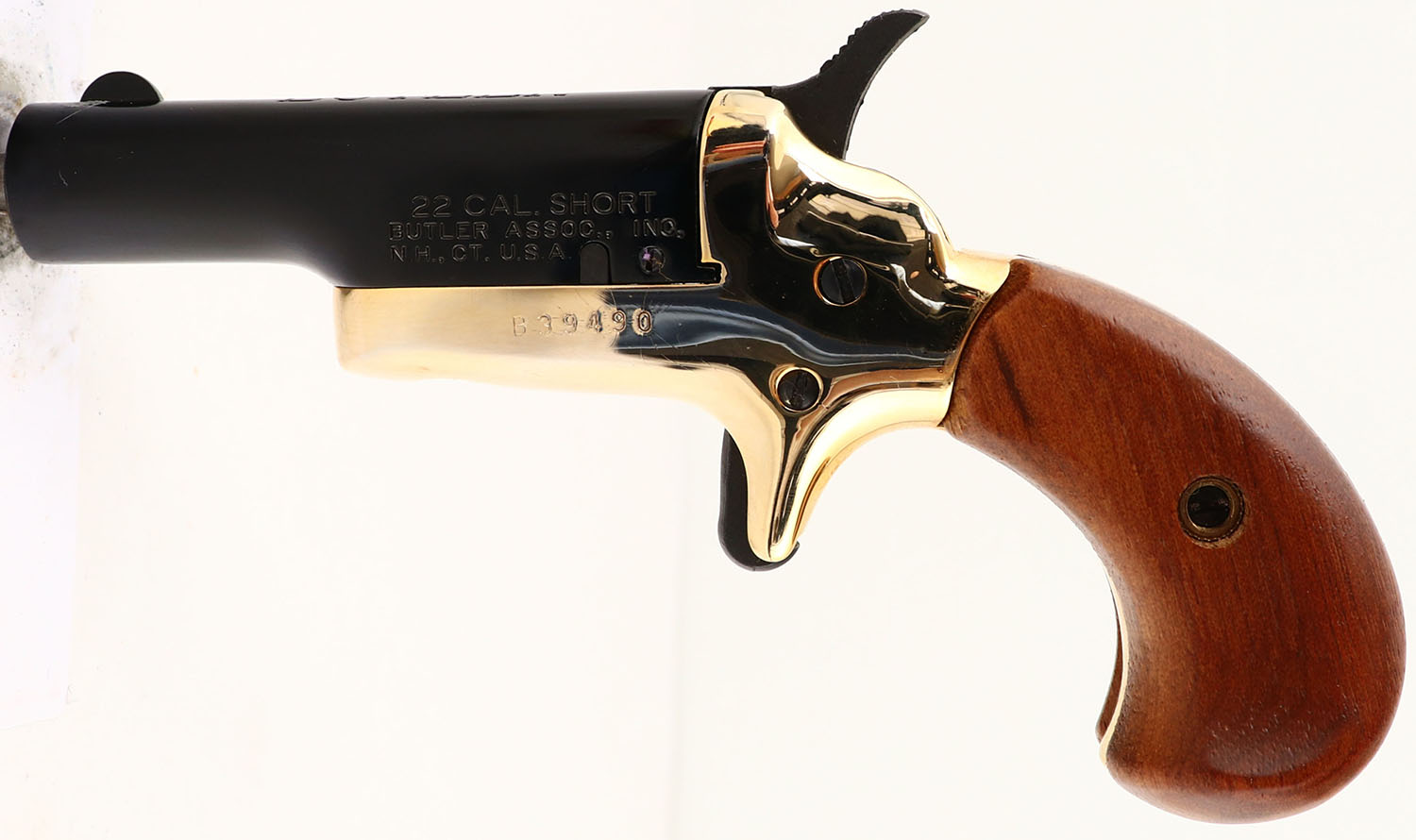 BOXED, Butler, Derringer, CAL: 22 SHORT, MFG: Modern, SN: B39490, Singler Action Pistol, 2 3/8'' barrel. The smooth wood grips are excellent. The high polish two-tone gold/blue finish rates 98% overall. There is a spot of flaked off finish on the left side of the front sight. Bore is excellent. Blade front sight. Comes in factory box. FFL Req. - Value: 100 to 200