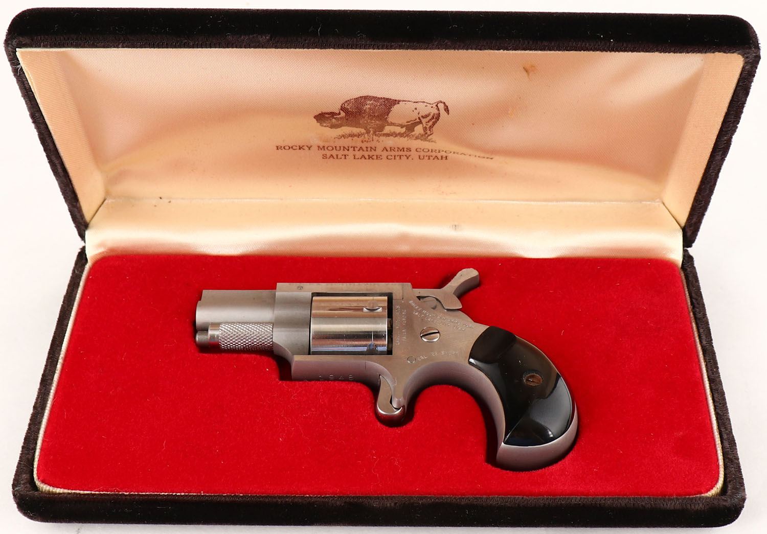 CASED, Rocky Mountain Arms Corp., Casull Model A225, CAL: 22 SHORT, MFG: Modern, SN: 1948, Single Action Revolver, 1 3/16'' barrel. The synthetic black grips are excellent. The two-tone stainless steel finish is excellent. Bore is excellent. Integral rear sight. Comes with factory case, outer cardboard sleeve & owners manual. FFL Req. - Value: 100 to 200