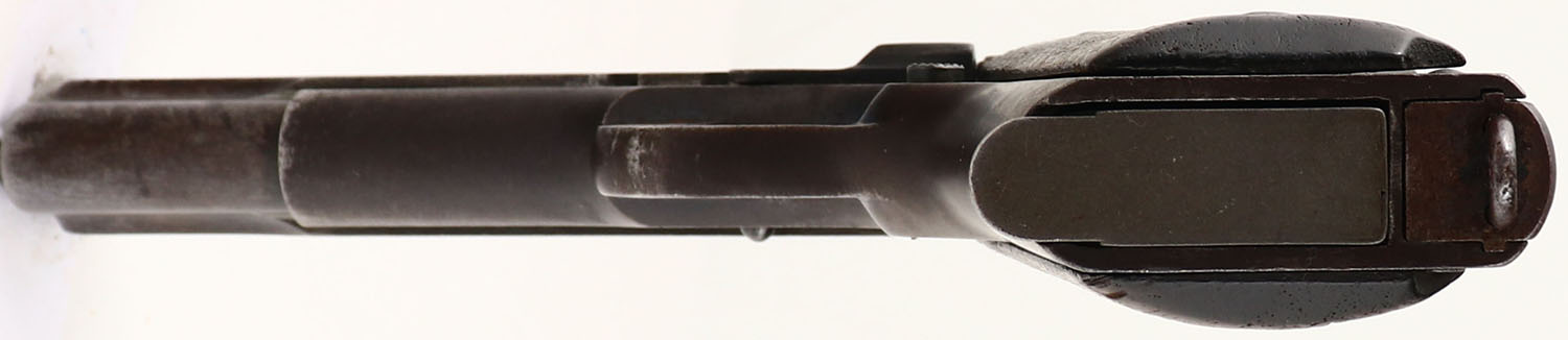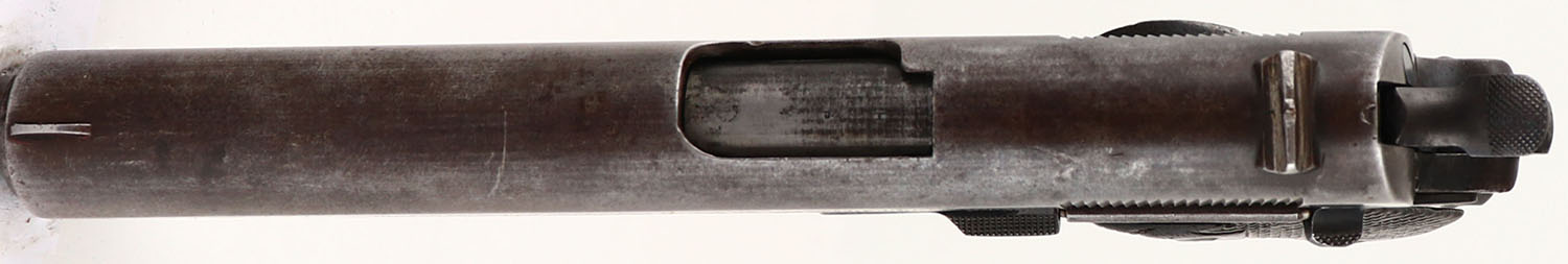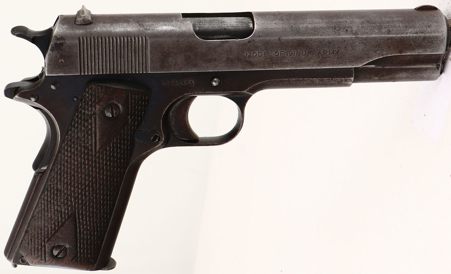 Colt, Model: M1911, Cal: .45 ACP, MFG: 1918, S/N: 223490, semi-auto pistol, 5'' barrel. The checkered, diamond, walnut grips are good. They are structurally fine with no cracks, chips, & one small dings & dents, they just display heavy use wear & the checkering is starting to wear smooth around the edges. The metal on the slide has worn to a gun metal gray, with spots of brown patina & scratches. The metal on the frame has toned to a brown patina with areas of thinned blue & heavy wear spots have worn to a gun metal gray. The left side of the slide is marked with the colt patent dates, a worn rampant colt logo, ''COLT'S PT.F.A.MFG.CO.'', ''HARTFORD.CT.U.S.A.''. The right side of the slide is marked ''MODEL OF 1911.U.S.ARMY''. The left side of the frame is marked ''UNITED STATES PROPERTY''. The left side of the frame by the mag release button is marked with the inspectors mark ''GHS'' in a circle, which is for Major Gilbert H. Stewart. The right side of the frame is marked with the S/N. the top of the barrel is marked ''H'', ''P''. the bore is good. Its bright with roughness & thinned rifling. The slide holds a blade front sight with a V-notch rear sight, part of the right ear of the rear sight is broken off. Pistol comes with one green/gray parkerized WW2 era mag. A well used M1911 that has seen a lot of service. FFL or C&R Req. - Value: 500 to 1000