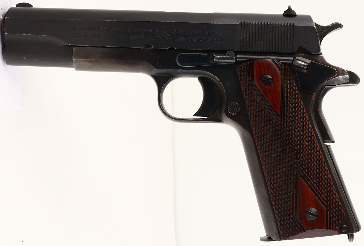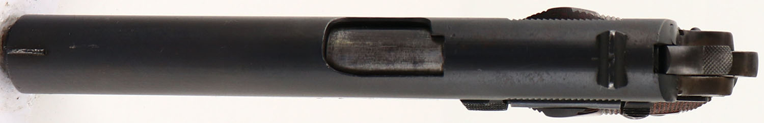 Colt, Model: M1911 U.S. ARMY, Cal: .45 ACP, MFG: 1918, S/N: 428295, Semi-auto pistol, 5'' barrel. The checkered, diamond, walnut grips are excellent ,with light finish wear & some smoothing of the checkering. The metal reblue finish rates 90% on the slide, 80% on the frame, with the frame toning more gray/brown as it thins. The left side of the slide is marked with patent dates, Rampant Colt logo, ''COLT'S PT.F.A.MFG.CO.'', ''HARTFORD.CT.U.S.A.''. The right side of the slide is marked ''MODEL OF 1911.U.S.ARMY''. The left side of the frame is marked with a eagles head over ''S5'', which is a Springfield armory acceptance stamp, & ''14'' on the trigger guard. The right side of the frame is marked with the S/N. The left side of the frame on a 1911 U.S. ARMY, with the eagle ''S5'' stamping, should aslo should be stamped ''UNITED STATES PROPERTY'' on the left side of the frame. While the frame does show some buffing & polishing, including thinning of the eagle ''S5'' stamping in preparation for the reblue, it doesn't appear in our opinion that there was enough buffing to have removed the ''UNITED STATES PROPERTY'' stamping. Removing of U.S. military proof & property stampings is not uncommon on U.S. Military owned guns, as for many decades it was generally illegal for civilians to possess 1911s clearly marked as US government property. After WW2 when the government finally allowed sales of these pistols on the surplus market, it became irrelevant. Some owners or possessors of these guns likely wanted to try & eliminate that trail of ownership or the military's right of retained ownership. It is therefore very likely that this stamping was removed & it was simply done very well or professionally. WWI ended on November 11th 1918, & since this pistol according to SN production records dates to 1918, there is always a small possiblity that this pistol did not receive the ''UNITED STATES PROPERTY'' stamping even though it did receive the eagle ''S5'' stamping that should have been the final military stamping. It remains a mystery to us. The bore is very good & bright, with lightly thinned rifling. The slide holds a blade front sight, with a U-notch rear sight. Pistol comes with one period correct, two-tone Colt mag. This pistol appears to be a commercially sold M1911 U.S. Army, without the correct ''UNITED STATES PROPERTY'' mark of a military used model. FFL or C&R Req. - Value: 800 to 1500