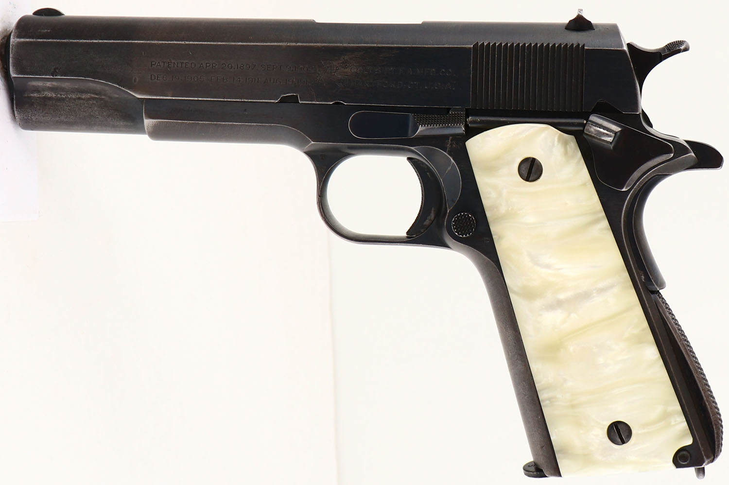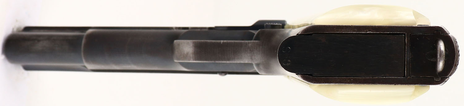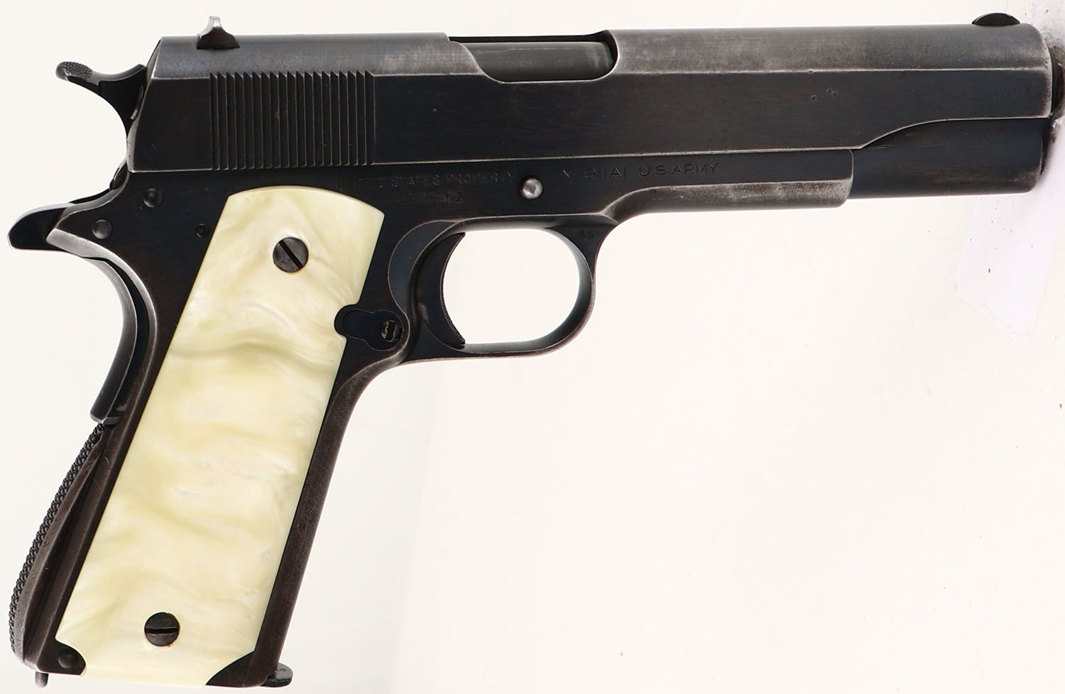 Colt, Model: M1911A1, Cal: .45 ACP, MFG: 1940, S/N: 720501, Semi-auto pistol, 5'' barrel. The replaced, plastic faux-pearl grips are excellent. The blued metal finish on the frame rates 70% with almost full coverage, just areas of thinning. The blued metal finish on the slide rates 75% with almost full coverage just areas of thinning, there is one small spot of cleaned light pitting right next to the rampant colt logo on the left side. The darker tone on the front 1/3 of the slide is from that part being hardened to help increase its strength, leading to the metal holding onto the bluing better than the un-hardened section. The left side of the slide is marked with colts patent dates, the rampant colt logo, & ''COLT'S PT.F.A.MFG.CO.'', ''HARTFORD.CT.U.S.A.''. The right side of the frame is marked ''UNITED STATES PROPERTY'', ''M1911A1 U.S. ARMY'', the S/N, & a ''69'' on the trigger guard. The left side of the frame is marked ''CSR'' by the slide catch, its the inspector stamp for Major Charles S. Reed, who was a Army Ordinance inspector at colt from 1938-40. there is a ''P'' mark by the mag release button which is just a basic proof mark. The left side of the trigger guard is marked with a ''T'', & a ''VP'' in a triangle stamp which is the colt verified proof factory inspection stamp. The top of the barrel is marked ''COLT .45 AUTO''. The bore is very good. Its bright & mirror like with light rifling thinning. The slide holds a wide blade front sight with a U-notch rear sight. Pistol comes with one mag marked ''C-S'' on the bottom of the floorplate & ''S'' on the upper part of the floorplate. A very nice example of a early war colt & one of the last blued M1911's for the military. FFL or C&R Req. - Value: 600 to 1200