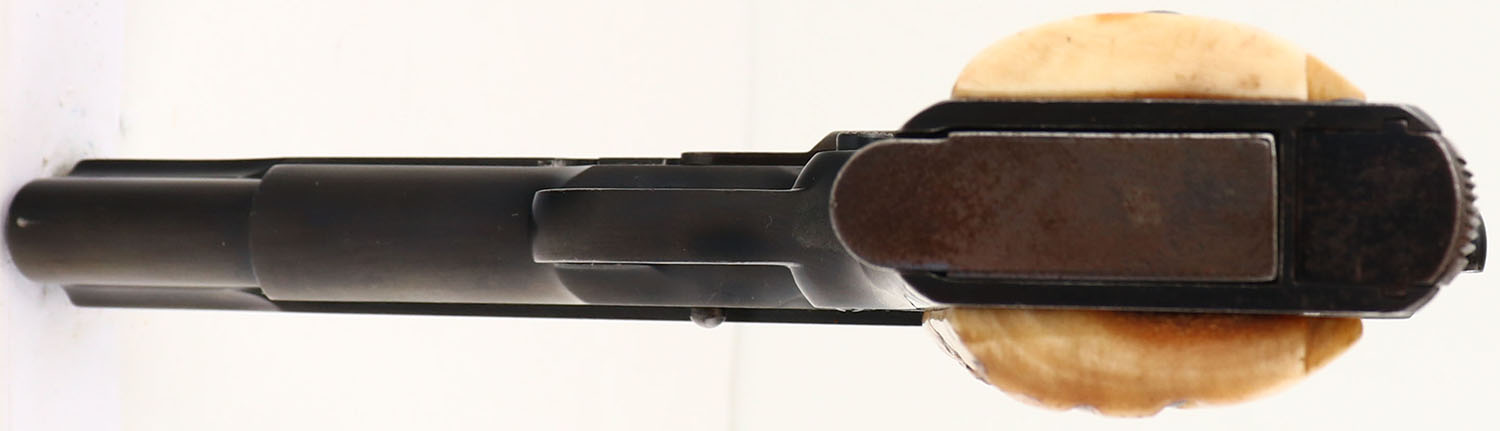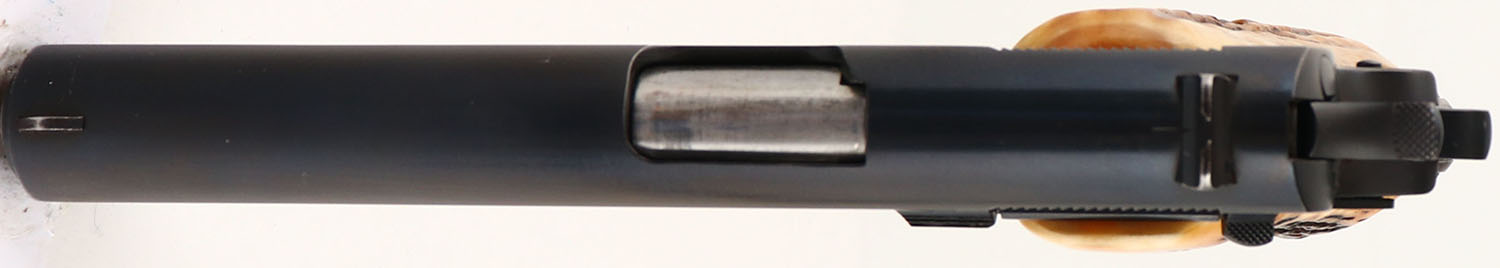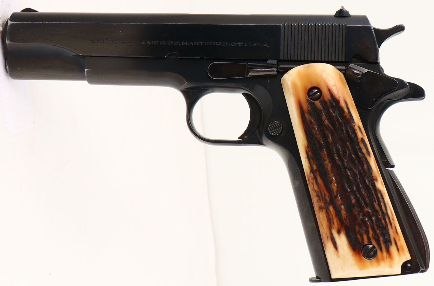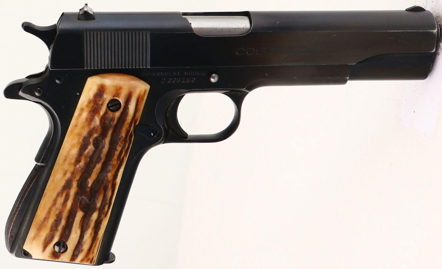 Colt, Model: M1911A1 Government Model, Cal: .45 ACP, MFG: 1947, S/N: C225152, Semi-auto pistol, 5'' barrel. The replaced, real stag grips are excellent. The blued metal finish rates 95% overall with light holster wear, very light wear from the action cycling, & one small spot of brown patina /rust on the right side of the frame. The left side of the slide is marked ''COLT'S PT.F.A.MFG.CO.HARTFORD.CT.U.S.A.''. The right side of the slide is marked ''COLT AUTOMATIC CALIBRE .45'' & a rampant colt logo. The right side of the frame is marked ''GOVERNMENT MODEL'', & the S/N. the left side of the trigger guard is marked with a ''R'', & a ''VP'' in a triangle stamp which is the colt verified proof factory inspection stamp. The right side of the trigger guard is marked ''71''. The next lot is another Colt M1911 Government model that is less that 3000 pistols off in the S/N, both pistols have the same exact imperfections in the stampings, specifically the ''.'' in the ''HARTFORD.'' stamp on the left side of the slide, also the ''I'', & ''E'' in the ''CALIBER'' mark on the right of the slide. They even have the same fading on the bottom of the rampant colt logo. Its in our opinion that both pistols have not been re-blued & the imperfections were caused by worn out stamps from the factory & not from having been altered or buffed & re-blued. The bore is very good with roughness. The slide holds a wide blade front sight with a square notch rear sight. Pistol comes with one mag. A very nice example a Colt Government Model M1911 that was made just after WW2.. FFL or C&R Req. - Value: 1000 to 2000
