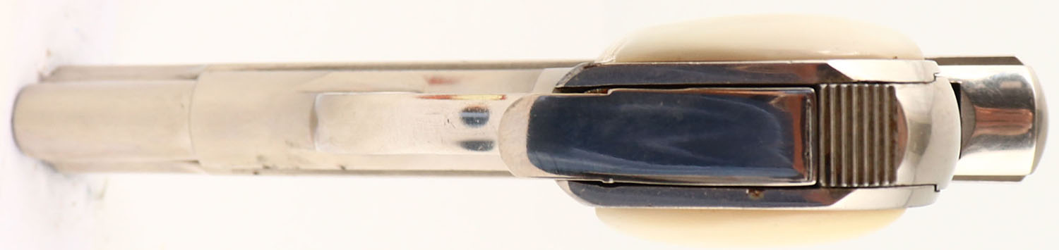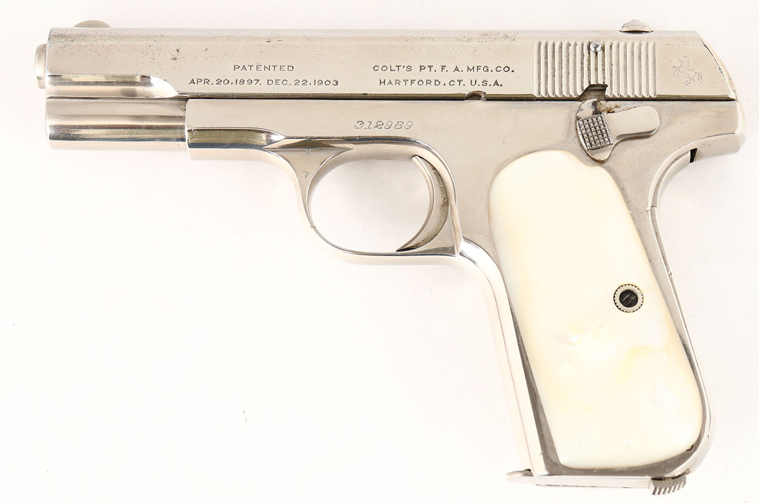 Colt, 1903 Pocket Type III, CAL: .32ACP, MFG: 1919, SN: 312984, Semi Auto Pistol, 3 3/4'' barrel. The Mother of Pearl grips are excellent, with beautiful figure & colors. The nickel finish is excellent, rating 95% overall, with visible brush lines, consistent light spotting on the slide & a small area of flaking on the right side. Bore is good, consistently rough with intermittent light pitting. Rear notch & blade front sight. FFL or C&R Req. - Value: 700 to 1200