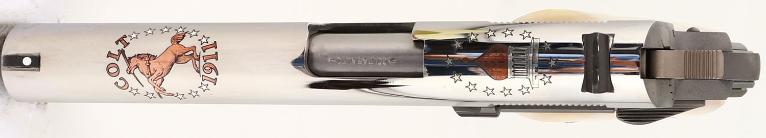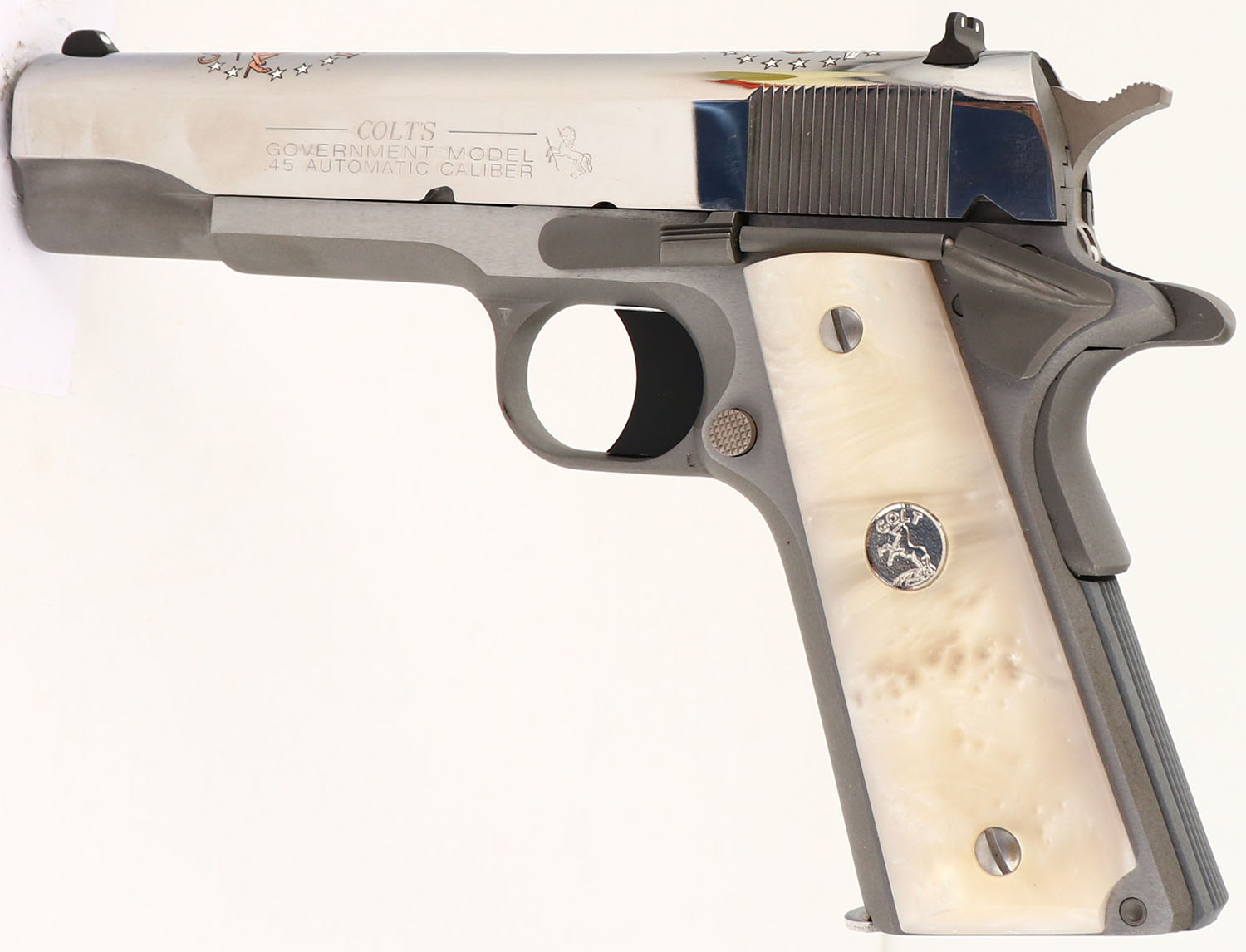 CASED, Colt 1911 Government Model 100 Years of Service Edition, CAL: 45 ACP, MFG: 2011, SN: CV32670, Semi Auto Pistol, 5'' barrel. The Colt logo medallion faux pearl grips are mint. The two-tone matte & polished stainless steel finish are both excellent. The slide has a mirror-like finish. Bore is mint. Factory contrast sights. Comes in factory hard case, with related paperwork, packaging, lock/key. FFL Req. - Value: 1500 to 2000
