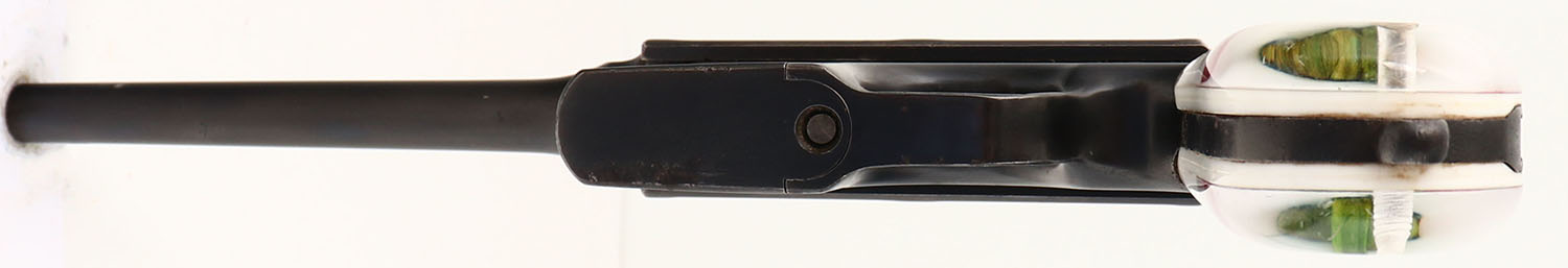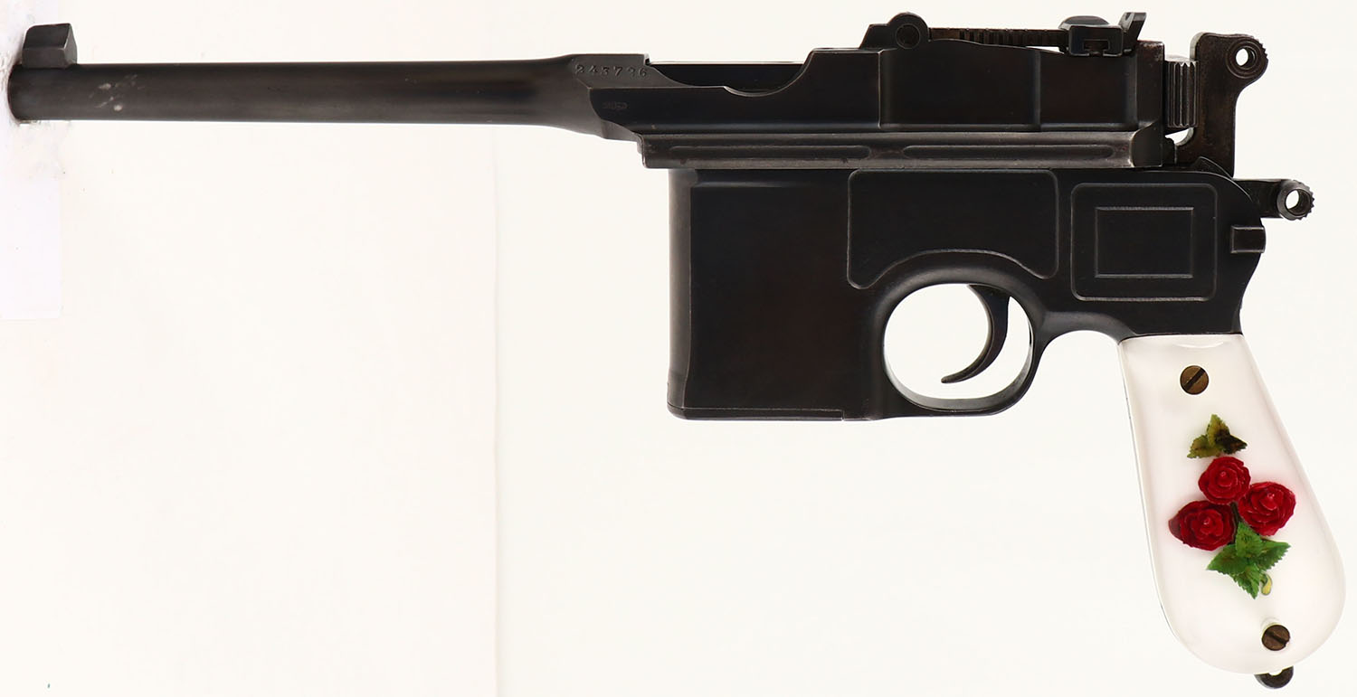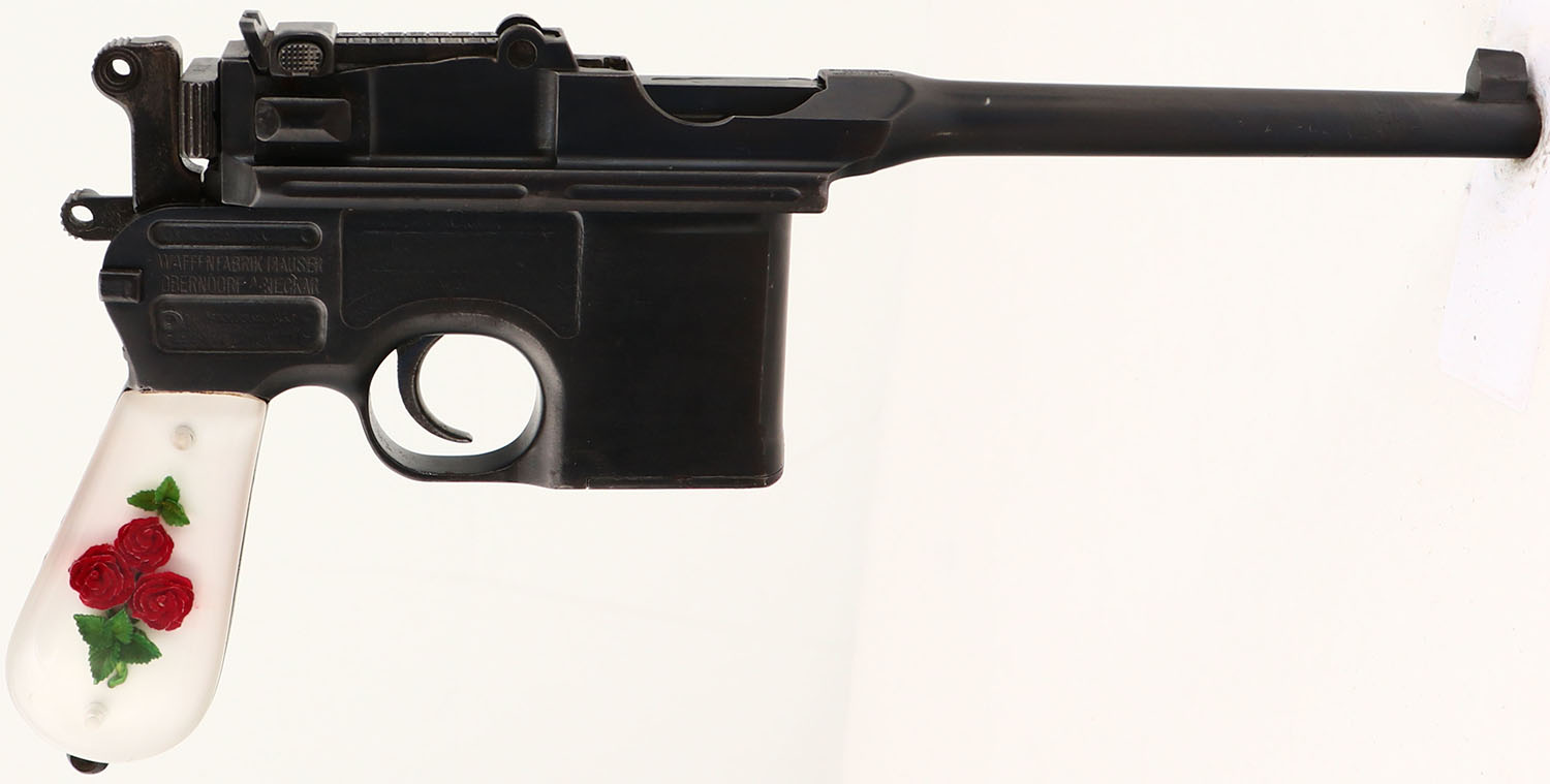 CONDITION: The aftermarket, rose in epoxy grips are excellent with a few small scratches & scuffs. The metal has been re-blued, & as such rates 90% with a couple small spots of wear & thinning. The left side of the upper assembly is marked with the S/N & a proof stamp. The top barrel flat is marked ''WAFFENFABRIK'', ''MAUSER'', ''OBERNDORF/N''. The right side of the lower frame is marked ''WAFFENFABRIK MAUSER'', ''OBERNDORF A NECKAR''. Some of the markings have wear from buffing when it was re-blued. The rear of the grip frame is marked with the S/N. the bottom of the barrel has a few proof marks. All serialized parts are S/N matching. The bore is very good. Its bright & mirror like with light rifling thinning. The barrel holds a barleycorn front sight with a tangent, V-notch rear sight marked 50 to 1000. FFL or C&R Req. - Value: 500 to 1000