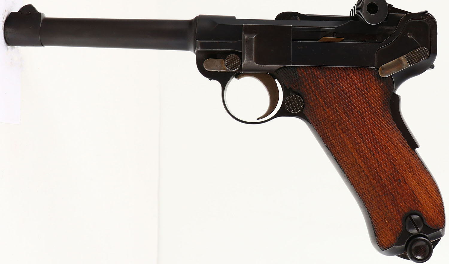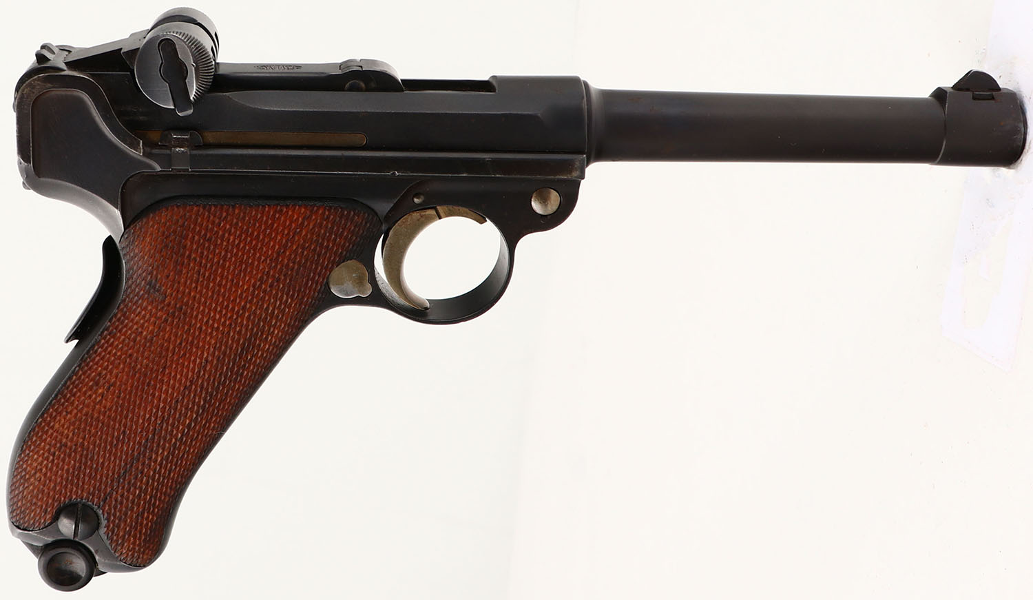 DWM, Model: 1902 Commercial Luger, Old model Short Frame, Cal: 9x19mm Parabellum, MFG: 1902-06, S/N: 4550, Semi-auto pistol, 4 3/4'' barrel. The checkered wood grips are very good with light wear & stains. The metal has been re-blued & as such rates 90% with areas of light wear, rust/patina speckling, & spots of cleaned pitting with blue inside. The left side of the upper assembly is marked with a crown over ''B'', & a crown over ''U'' proofs, both marks are faded from buffing. The top of the toggle is marked with the DWM logo. The front of the frame is marked with the S/N & ''GERMANY''. All visible serialized parts are S/N matching. The bore is excellent. Its bright & mirror like with almost no visible wear. The barrel holds a small barleycorn front sight with wide V-notch rear sight. Pistol comes with one black Bakelite/plastic base mag. Pistol is missing the toggle link pin that connects the toggle to the breech block, & is being sold AS IS with NO RETURNS ACCEPTED (UPDATED 8/28/2024- a replacement pin has been put into the pistol to restore full functionality, still being sold with no returns accepted). A very unique & hard to find model of luger. FFL or C&R Req. - Value: 600 to 1200