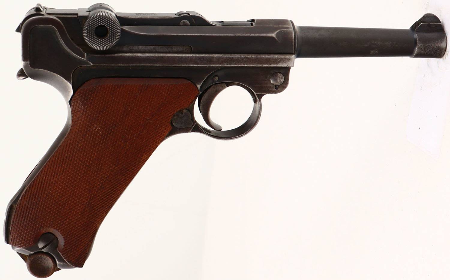DWM, Model: 1920 Commercial Luger, Cal: 7.65x21mm Parabellum, MFG: 1920-22, S/N: 9715, semi-auto pistol, 3 3/4'' barrel. The checkered wood grips are very good with light scuffs, wear, & stains. The metal finish appears to have been re-blued a long time ago with areas of more wear & brown patina setting in & proof marked faded. as such the finish rates 70% overall. The left side of the upper assembly is marked with one crown over ''N'' proof mark. The front of the frame is marked with the S/N, & the S/N block letter ''P''. The bottom of the barrel is marked with a crown over ''N'' proof mark, the S/N, & the S/N block letter ''P''. The top of the toggle is marked with there DWM logo. All visible serialized parts appear to be S/N matched. The bore is good. Its bright with even roughness throughout & thinned rifling. The barrel holds a barleycorn front sight with a V-notch rear sight. Pistol comes with one wood base mag. FFL or C&R Req. - Value: 500 to 1000