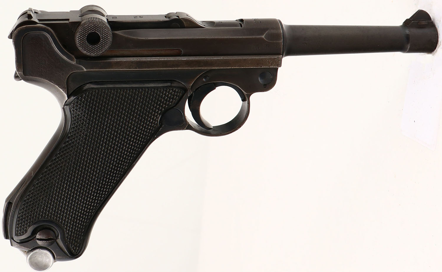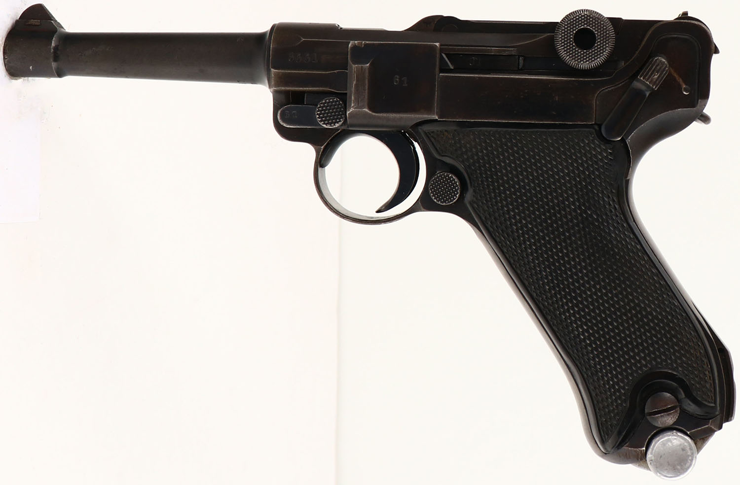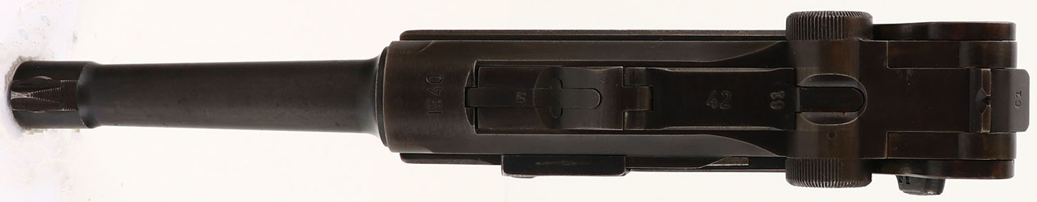 Mauser, Model: P08 Luger, Cal: 9x19mm, MFG: 1940, S/N: 3661, Semi-auto pistol, 4'' barrel. The checkered, black plastic grips are excellent with little to no wear. The blued metal finish rates 75% with areas of cleaned pitting, brown patina, & spots worn to gun metal gray. The left side of the upper assembly is marked with the S/N. the top of the upper assembly is marked ''1940''. The right side of the upper assembly is marked with three Waffenamt' s, the middle & far right stamp have are faded from wear. Front of the frame is marked with the S/N, & the S/N block letter ''m''. The right side of the barrel is marked with a iron eagle proof stamp. The bottom of the barrel is marked with the S/N, & ''8.81''. The top of the toggle is marked with the Mauser code ''42'' & the last two digits of the S/N. all visible serialized parts on the pistol are S/N matched. The bore is good. Its bright with roughness & thinned rifling. The barrel holds a barleycorn front sight with a V-notch rear sight. Pistol comes with one aluminum mag that's marked on the base ''3001'', ''t'', ''+'', & one Waffenamt proof stamp. FFL or C&R Req. - Value: 700 to 2000