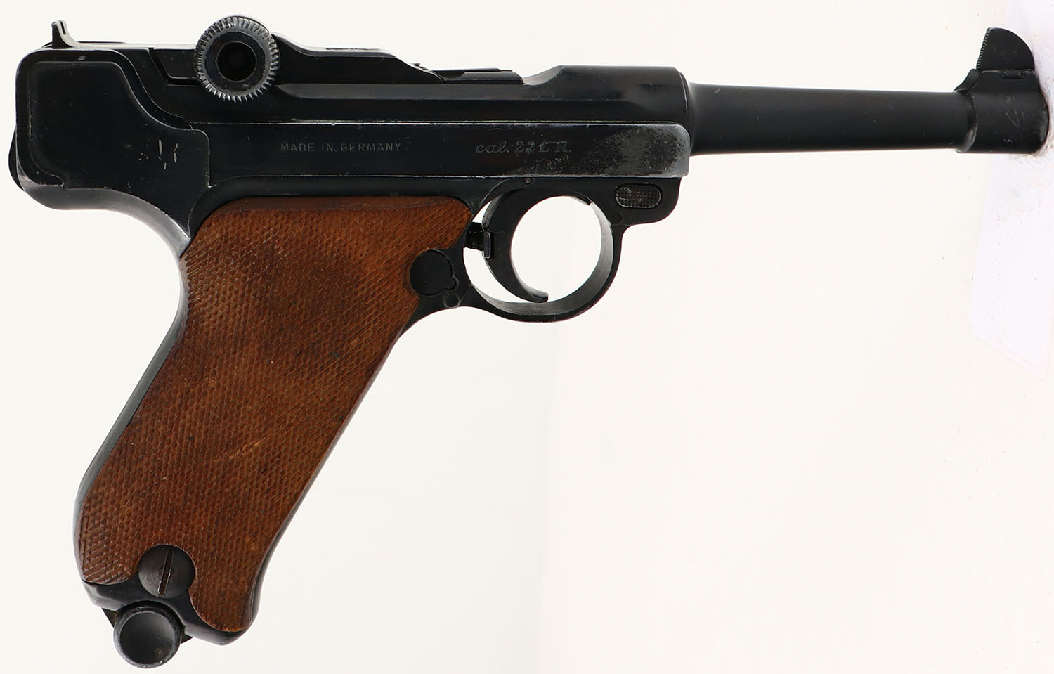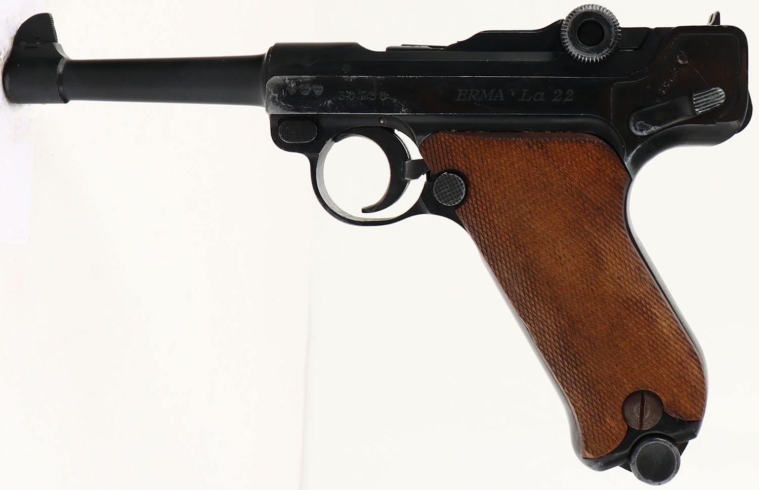 Erma-Werke, Model: La 22, Cal: .22 LR, MFG: 1964-67, S/N: 30738, Semi-auto pistol, 4 5/8'' barrel. The checkered wood grips are very good with light scuffs & wear. The blued metal finish rates 80% with holster wear & other spots of thinning/wear. The left side of the frame is marked with proof marks, the S/N, & ''ERMA La 22''. The right side of the frame is marked ''MADE IN GERMANY cal. 22 LR.''. The bore is excellent. Its bright & mirror like with little to no wear. The barrel holds a tall barleycorn front sight, with a U-notch rear sight. Pistol comes with one mag. FFL or C&R Req. - Value: 250 to 500