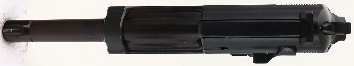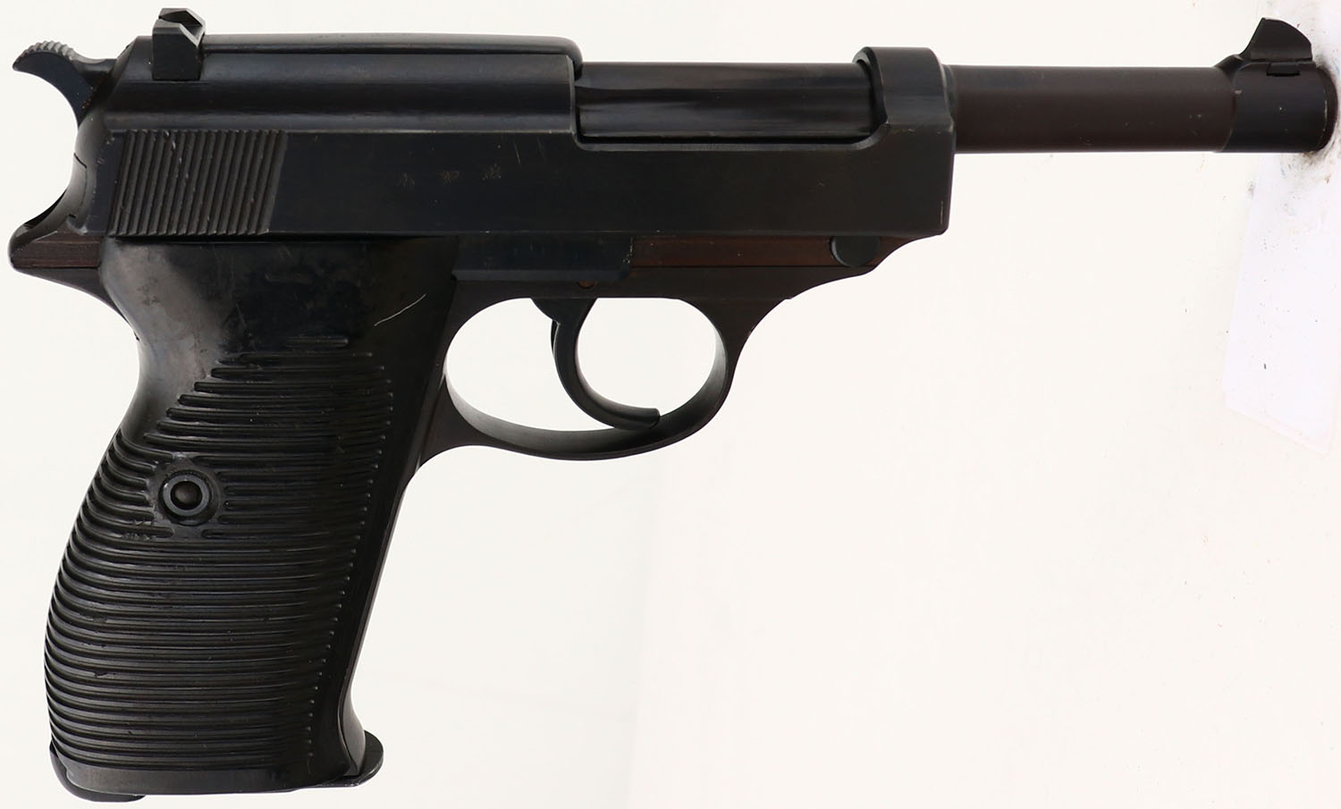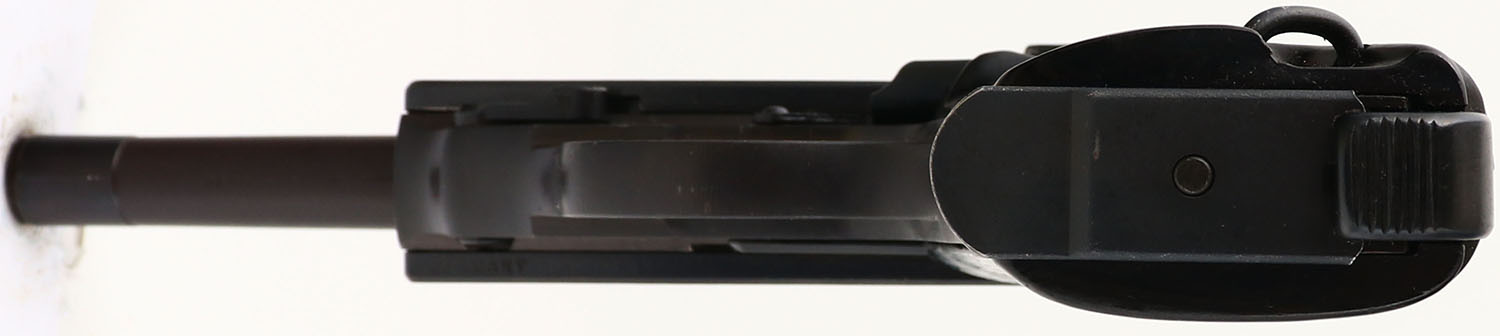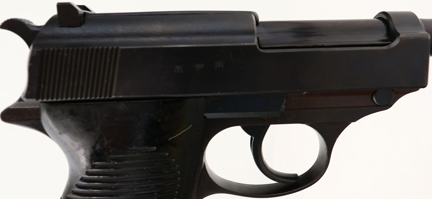 Walther (ac code), Model: P.38, Cal: 9x19mm, MFG: March 1942, S/N: 6931b, Semi-auto pistol, 4 7/8'' barrel. The grooved, Bakelite grips are very good with minor stains/scuffs. The metal finish has been re-blued, its looks to be a arsenal re-blue. As such it rates 95 % with little wear. The barrel has been replaced is a later Bundeswehr Spec marked, P1 barrel. The left side of the slide is marked ''P.38'', ''ac'' over ''42'', & the S/N, all the markings have been buffed & are thin. The right side of the slide is marked with two Waffenamt proof stamps, & one iron eagle proof stamp, all markings are slightly faded around the edges but are almost fully present. The front barrel lug is marked with a dot in a circle stamp, which means it was proofed & tested at the Walther plant in Ulm for the specifications of the Bundeswehr, a stamp that's just a circle with no dot means it was made for the commercial market, not the military. The left side of the barrel lug is marked with the S/N. The bottom of the barrel is marked with import stamps. The bottom of the right side of the slide is marked ''GERMANY''. The left side of the frame is marked with the S/N & a Waffenamt proof stamp. The right side of the frame also has a Waffenamt proof stamp. The bore is excellent. The barrel holds a tall, wide blade front sight with a U-notch rear sight. Pistol comes with one modern Walther mag. FFL or C&R Req. - Value: 400 to 800
