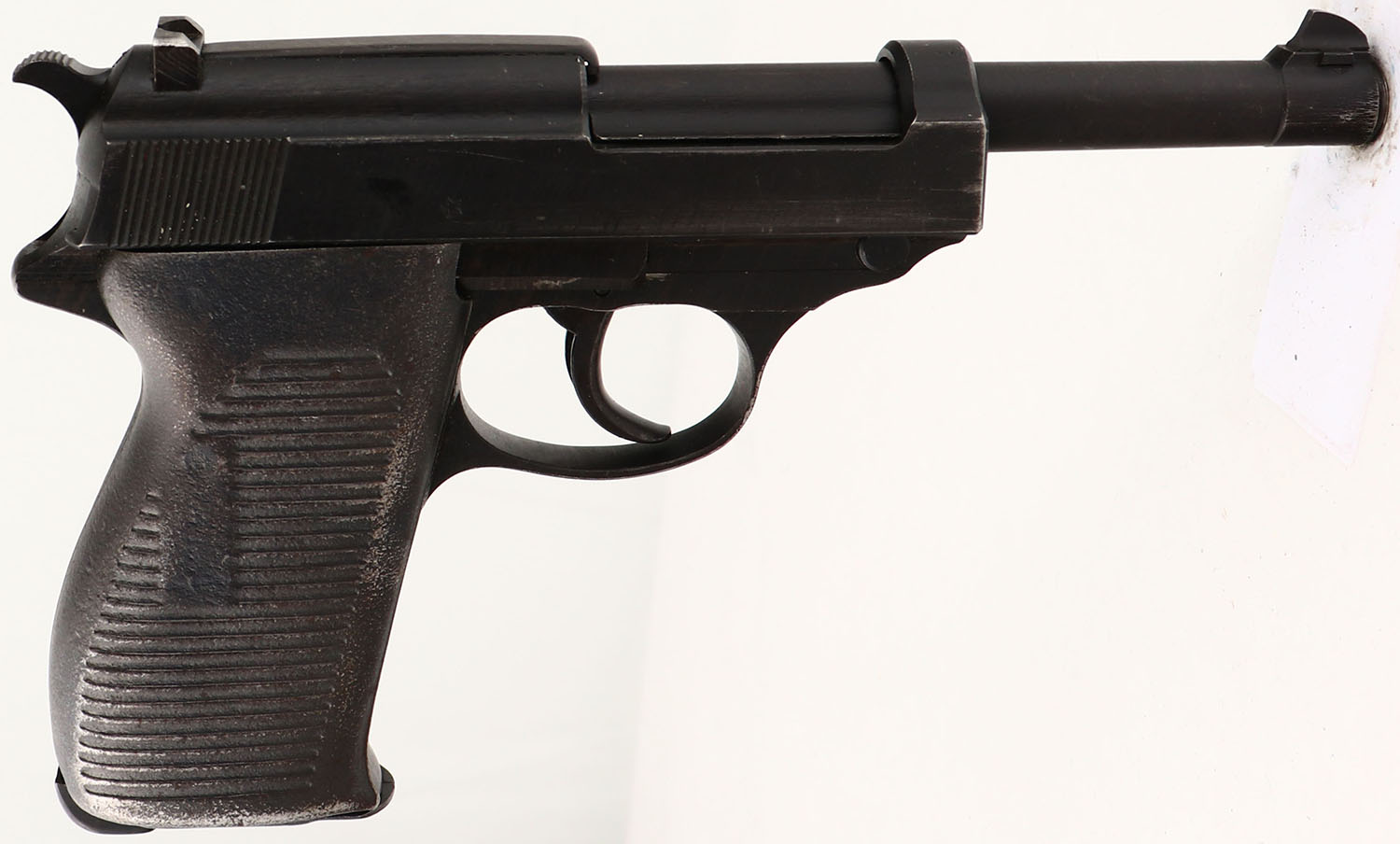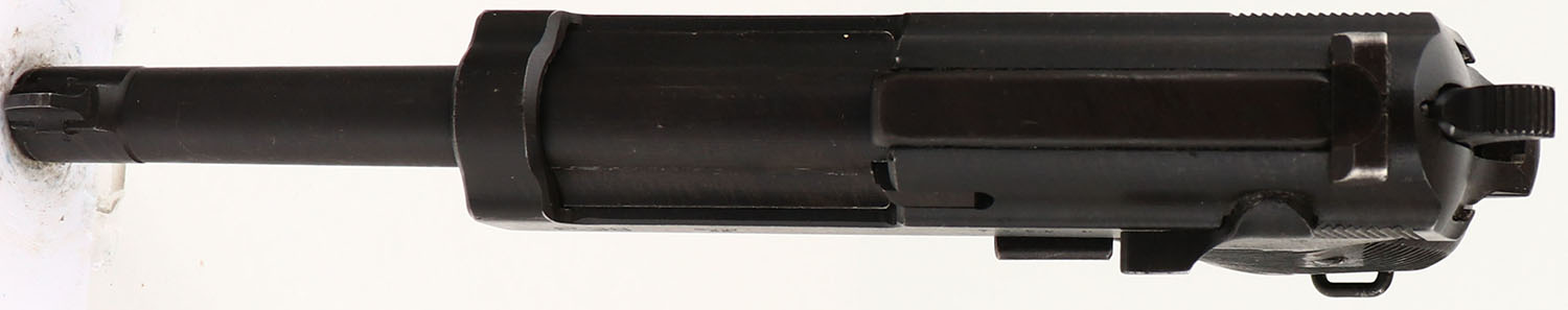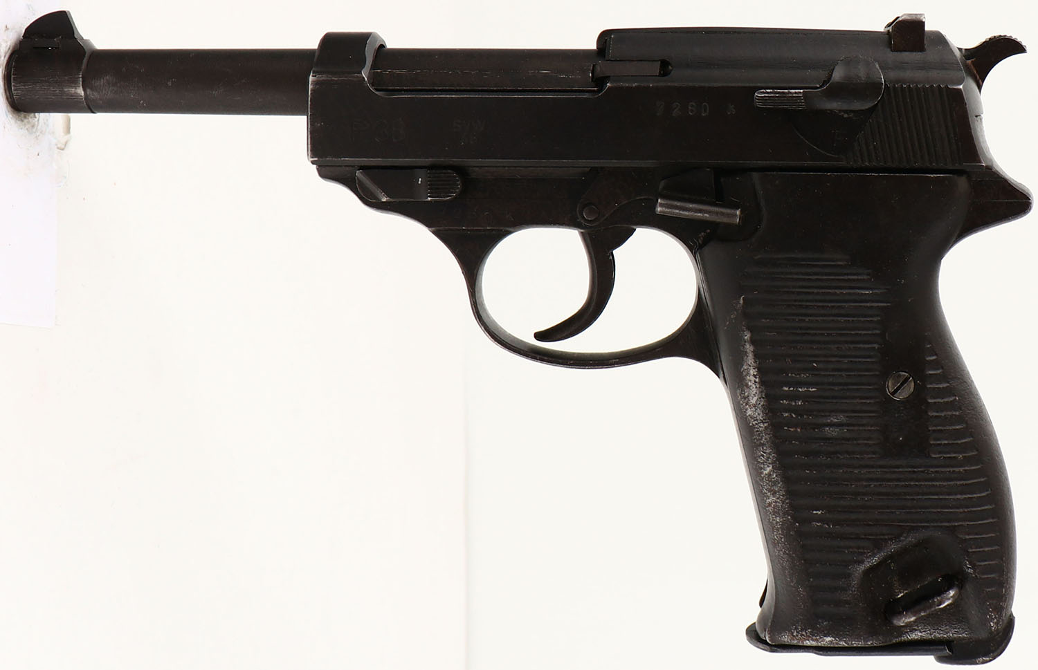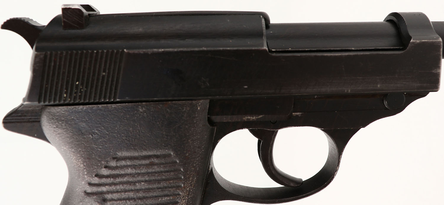 CONDITION: The grooved sheet steel grips are very good with only light scuffs & wear. The black phosphate finish rates 90% with light scratches & wear/thinning in small areas. The left side of the slide is marked ''P.38'', ''SVW'', ''46'', & S/N. the right side of the slide is marked with a French proof star. The left side of the frame is marked with the S/N. The front of the barrel lug is marked with the S/N. The bore is excellent. Bright & mirror like with almost no visible wear. The barrel holds a wide blade front sight, while the rear of the slide holds a U-notch rear sight. This pistol comes with one mag marked ''P.38.''. FFL or C&R Req. - Value: 600 to 1000