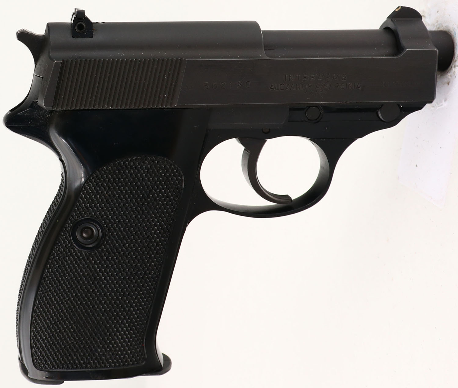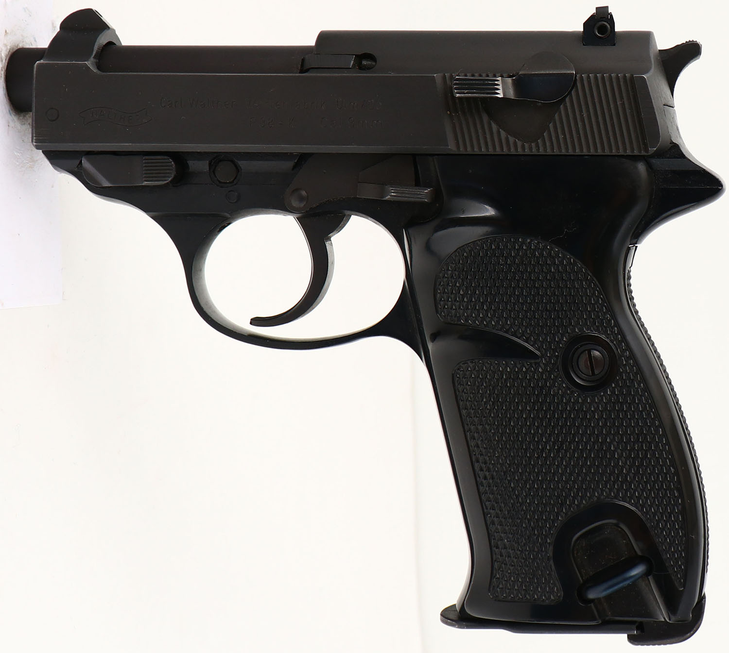 CONDITION: the black checkered, plastic grips are very good with a few light scuffs. The parkerized metal finish on the slide & barrel rates 97% with minimal wear. The left side of the slide is marked with a small dot in a circle. ''WALTHER'' in a banner, ''Carl Walther Waffenfabrik Ulm/Do'', ''P38-K Cal. 9mm''. The right side of the slide is marked with the S/N, ''INTERARMS'', ''ALEXANDRIA/VIRGINIA'', ''MADE IN GERMANY''. The front barrel lug is marked ''9 PARA''. The right side of the frame & slide are marked with proof marks. The bore is excellent. Its bright & mirror like with little to no wear. The slide holds a barleycorn front sight with a white dot in the middle, with a square notch rear sight with a white line in the middle. Pistol comes with one mag. A very interesting & highly collectable pistol. FFL Req. - Value: 1500 to 3000