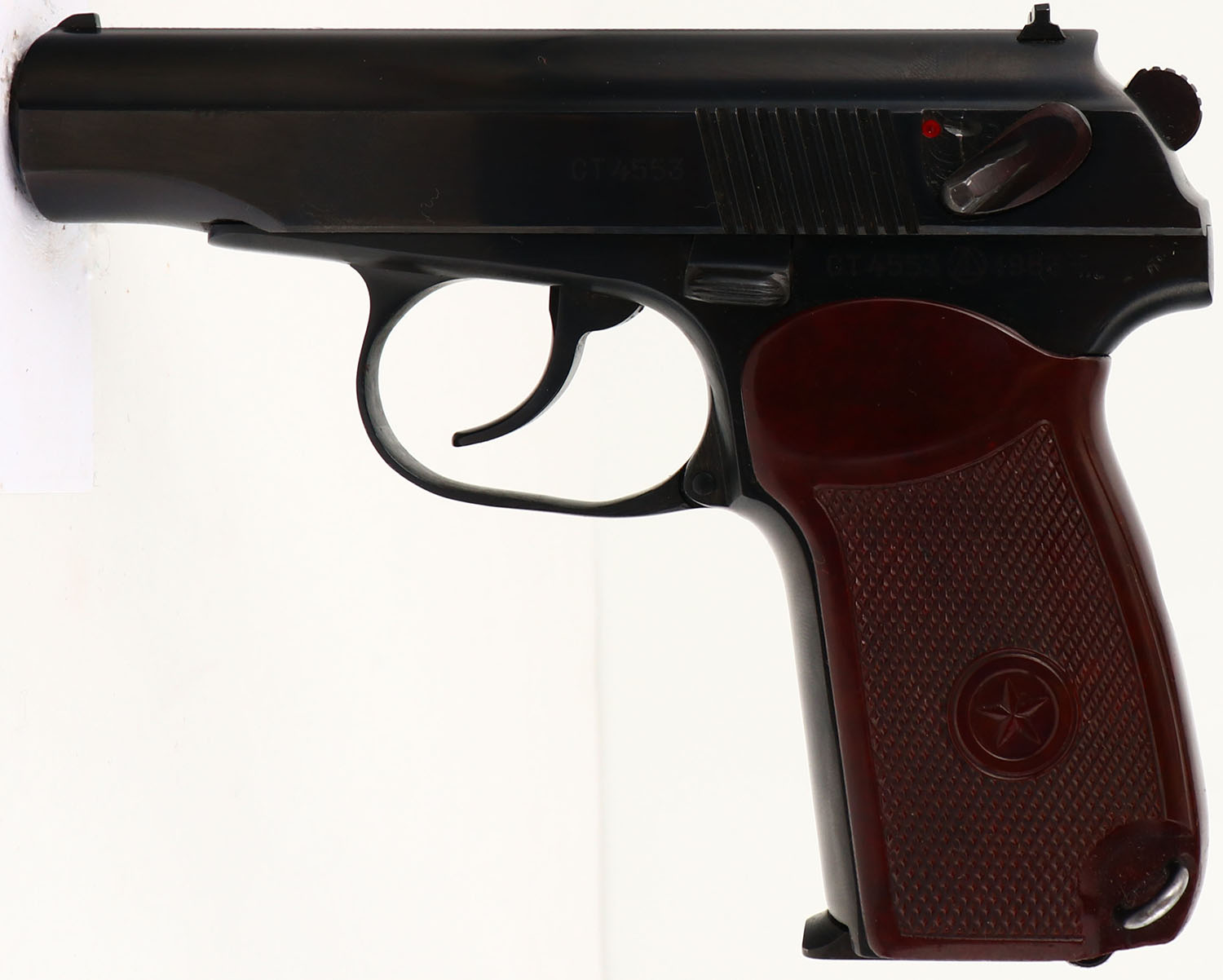 Izhevsk, Model: PM Makarov, Cal: 9x18mm Makarov, MFG: 1983, S/N: CT4553, Semi-auto Pistol, 3 3/4'' barrel. The checkered Bakelite grips are excellent with minor wear. Each grip has a star in a circle in the middle of them. The blued metal finish rates 95% with minor wear. The left side of the slide is marked with the S/N. the left side of the frame is marked with the S/N, Izhevsk factory logo, ''1983'', & a few other proof marks. The bore is excellent. The slide holds a blade front sight with a square notch rear sight. Pistol comes with one mag. FFL Req. - Value: 300 to 600
