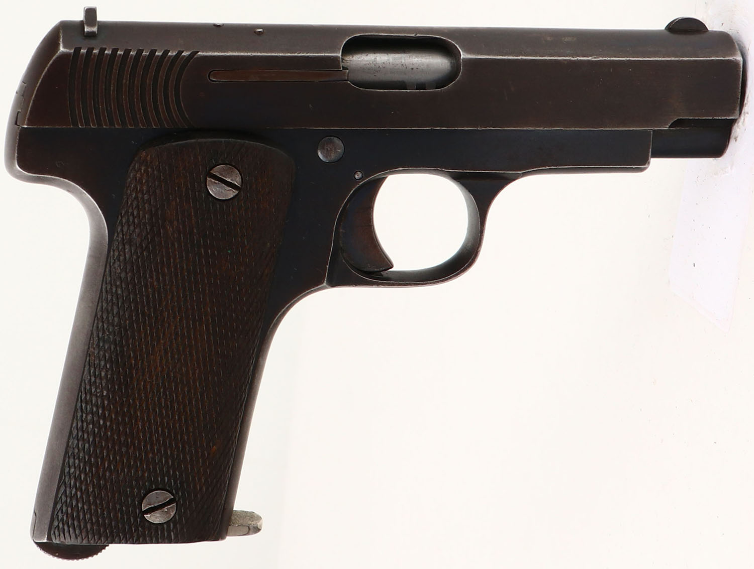 HISTORY: At the beginning of WW1 France would increase its military size by 2.9 million men, creating a massive strain to arm & supply those same men. The standard issue pistol for France at that time was the 1892 Ordnance revolver. Even with production of this revolver starting in 1892, the French government soon realized that the stockpile & production capacity for this revolver was not going to be enough. As a stop gap for this problem they started to bring out the older model pistols from storage for use with rear line troops, guy who wont really be shooting their guns much but still needed to be armed, and gave the newer pistols to the front line. At the same time France had the manufacture of the 1892 switch to full rifle & machine gun production, as they were in even greater need. Even with the older pistols in use the demand for pistol was continually growing & France would need more, FAST. At this time Spain was on of the largest manufactures of cheap civilian firearms in Europe. One of the copy's Spanish gun manufactures were making was a copy of the Colt made, browning design, Colt 1903 browning hammerless pocket pistol. France would soon notice the copy's made by Gabilondo y Urresti of Guernica, their trade name for the pistols was Ruby. This pistol made by Gabionade would be adopted by France and they contract for them to make 10,000 pistols a month, this would be upped to 30,000 pistols a month by the third quarter of 1915. this amount of pistols would be too much for Gabilondo to produce so they would turn to other manufactures in Spain to help fill the numbers. Gabilondo was to receive all the guns and check them for serviceability, then send them along to France. Soon other company's would catch on to Frances need for pistols & would start selling their pistols to France. The quality of the pistols would vary drastically, with some being excellent to some being down right unsafe to fire. Anyone looking to shoot a original ruby pistol should have it inspected by a gunsmith before firing. This pistol is a very nice example of a ruby pistol & would make a great addition to any collection.