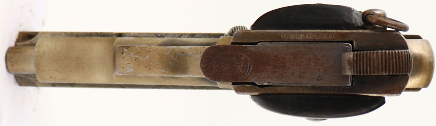 CONDITION: The checkered wood grips are very good. They have darkened from oils & age. Grips also have light wear & a few small chips. The metal was left in the white & has a added on lacquer finish. The left side of the slide is marked ''AUTOMATIC PISTOL''REPUBLIC''PATENT'', ''CAL 7.65''. The right side of the frame is marked with the S/N. the bottom of the pistol grip is marked ''MADE IN SPAIN''. The bore is very good. Its bright with roughness. The slide holds a blade front sight with a V-notch rear sight. Pistol comes with one mag that's marked ''AK'' in a circle. FFL or C&R Req. - Value: 200 to 400