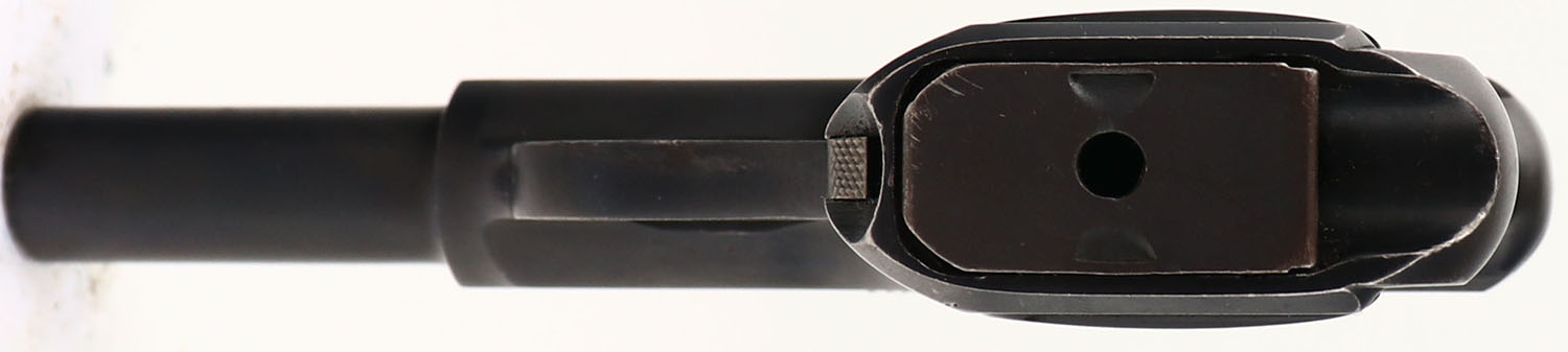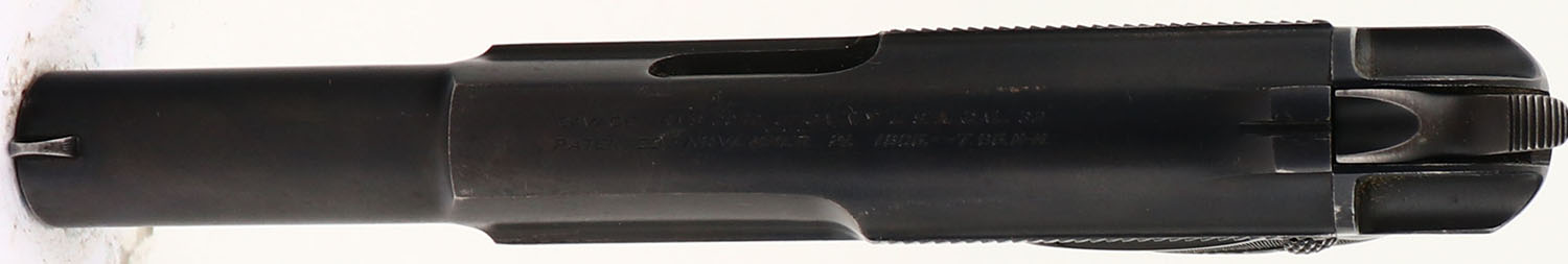 Savage, Model 1907, CAL: 32 ACP, MFG: 1919, SN: 222029, 3 3/4'' barrel. Although history indicates production began in 1907, real production didn't truly begin until 1908. Advertised with the slogan ''Ten shots quick!'', the Model 1907 was very popular because, despite its small size, it had a 10-round double-stack magazine. The checkered gutta-percha grips are excellent & feature a Savage Indian profile logo. There are minor scratches & scrapes. This is a later variation pistol, with the more narrow serrations on slide & the flatter blued finish. The metal blue finish rates 95% overall, with holster wear & spotting, toned to a brown patina. The case-hardened trigger displays excellent case-colors. Bore is good, consistently rough, with intermittent pitting amongst strong rifling. Integral notch rear sight & blade front sight. A nice example of a late production 1907. FFL or C&R Req. - Value: 400 to 750
