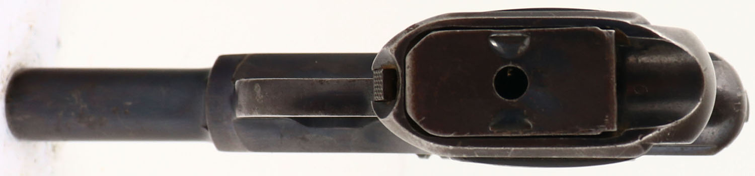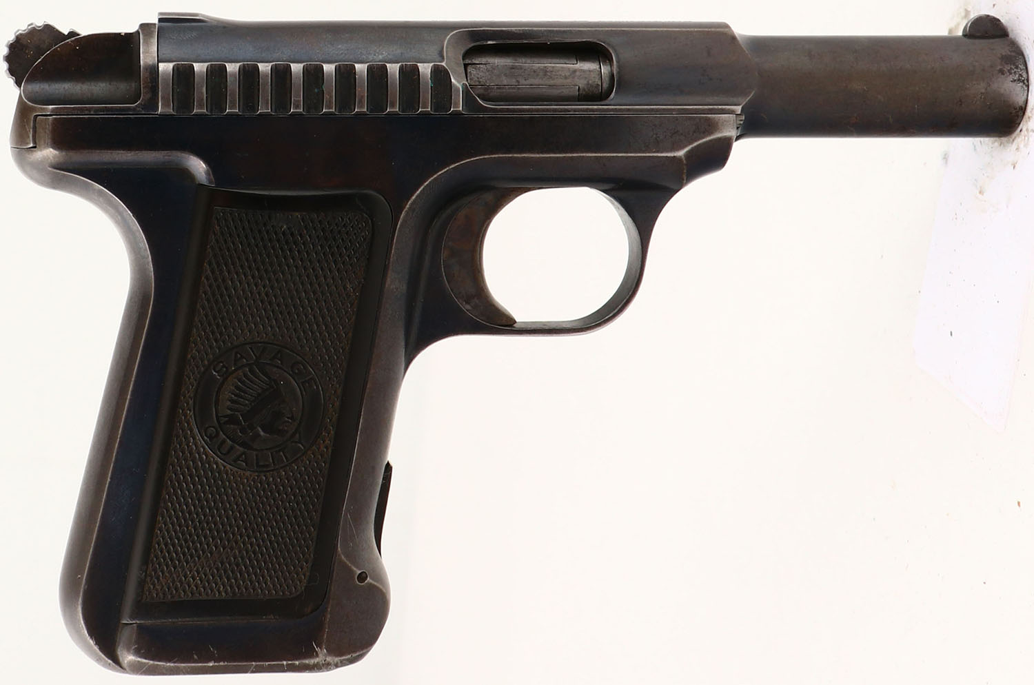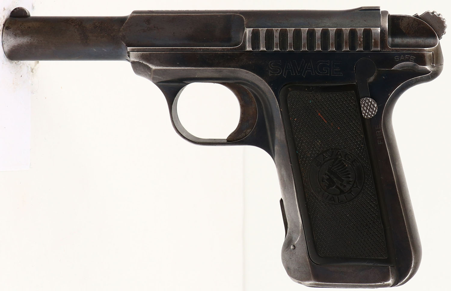 Savage, Model 1907, CAL: .32, MFG: 1914, SN: 101458, Semi Auto Pistol, 3 3/4'' barrel. The Savage logo checkered plastic grips are very good & solid. There is a small crack on the left grip, along with other contusions, scrapes & minor dings. This is the earlier varitation with the wider serrations & the high polish blued finish. The metal blue finish rates 30% on the barrel & 50% on the frame. Bore is very good & bright, with consistent light speckling throughout. Integral rear sight & blade front sight. The trigger pulls back, but the hammer does not drop. There is an unknown internal parts issue. Comes with an unmarked leather holster. FFL or C&R Req. - Value: 100 to 200