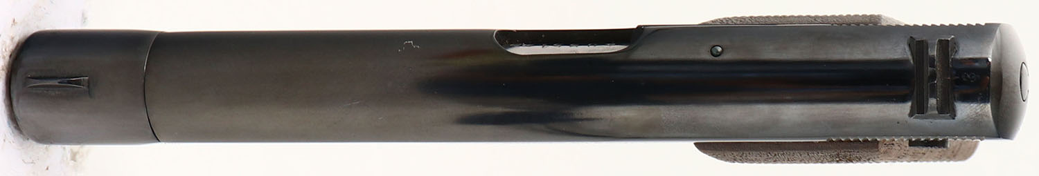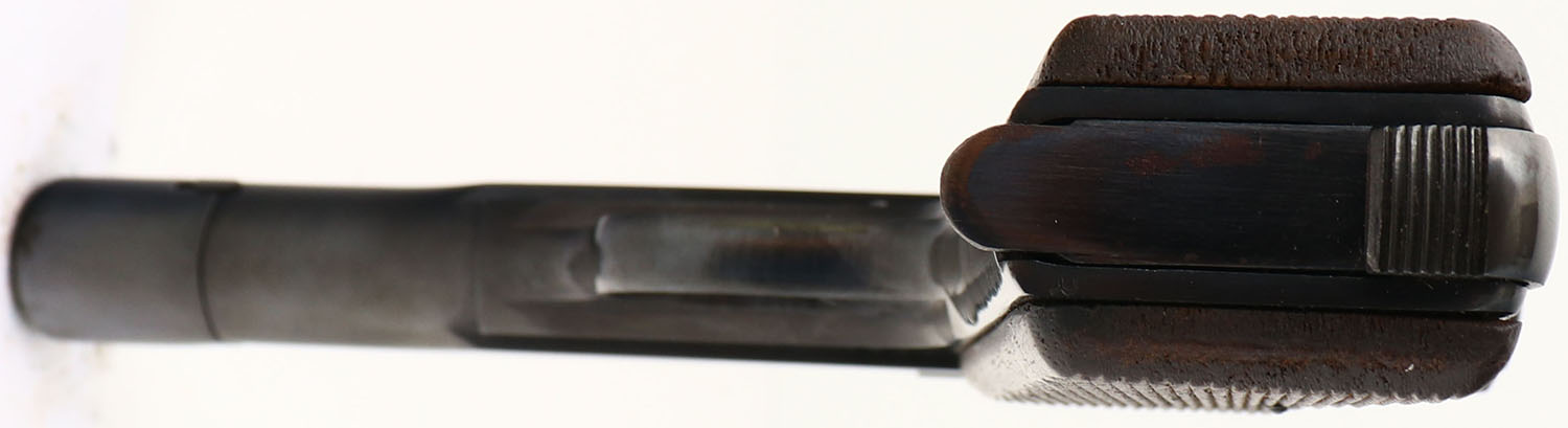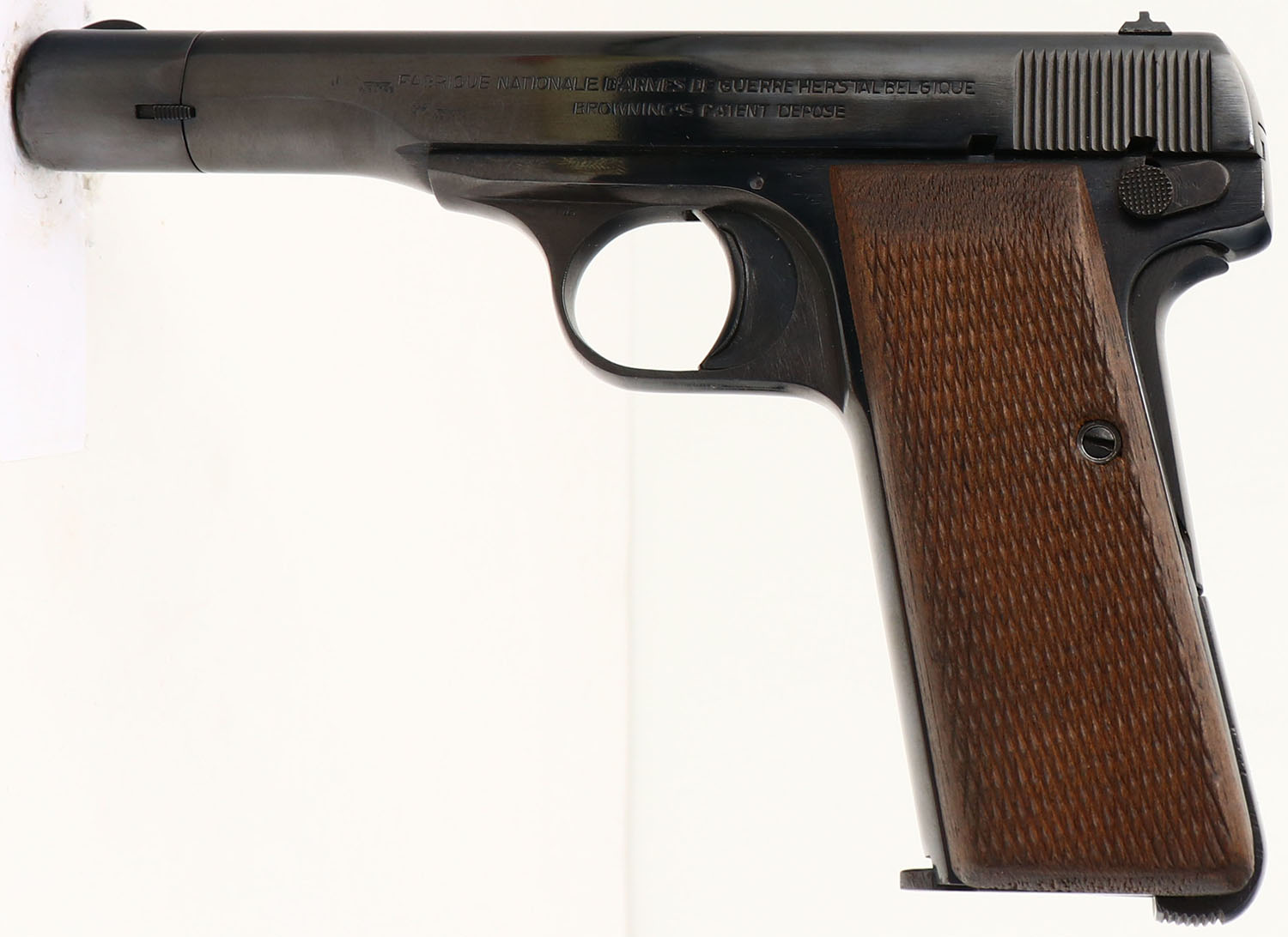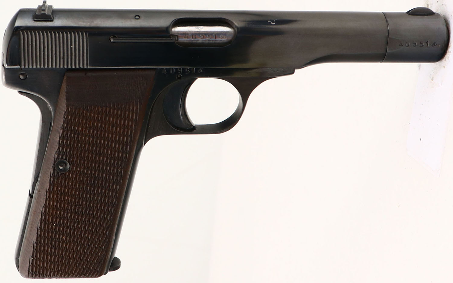NAZI MARKED, Browning (FN), Model: M1922, Cal: 7.65 (.32 ACP), MFG: 1940-44, S/N: 40951, Semi-auto pistol. The checkered wood grips are very good with light wear from use. The metal finish has been re-blued & rates as such rates 96% with minor wear. The left side of the slide is marked with two faded Waffenamt proof marks & a faint iron eagle stamp, ''FABRIQUE NATIONALE D'ARMES DE GUERRE HERSTAL BELGIQUE'', ''BROWNING'S PATENT DEPOSE''. The left side of the trigger guard is marked with a faint ''MR''. The right side of the frame, barrel, & end slide cap, are all marked with the S/N. The bore is excellent. Slide holds a blade front sight with a V-notch rear sight. Pistol comes with one mag. This pistol was made when the Germany army occupied the FN plant in Belgium during WW2. FFL or C&R Req. - Value: 400 to 800