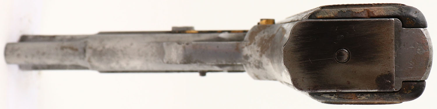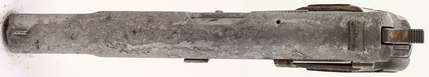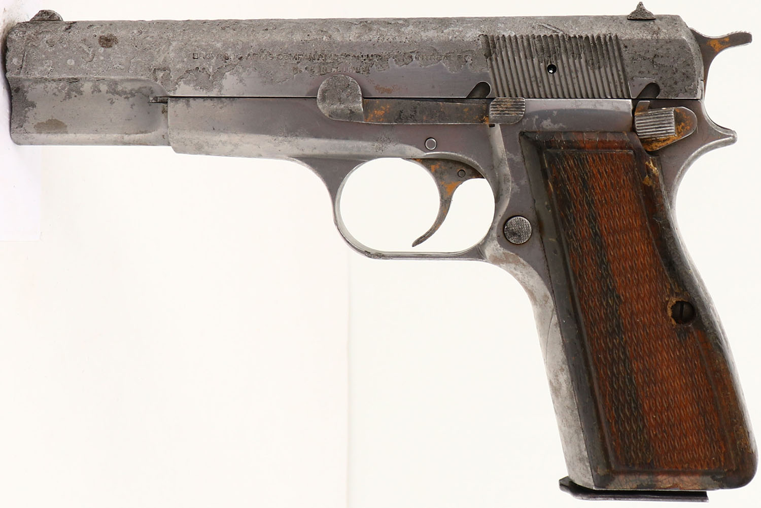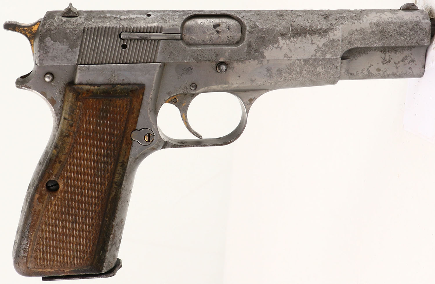 Browning, Hi-Power, CAL: 9mm, MFG: 1972, SN: 72C43386, Semi Auto Pistol, 4 3/4'' barrel. The checkered wood grips are excellent & solid. The finish on the grips is hazy, cracking & flaking. The metal is left ''in-the-white''. There is no finish present. The slide is heavily pitted, with intermittent pitting across all other metal components. Bore is very good, with areas of roughness & light pitting. Fixed sights. This is what the consignor refers to as a ''Katrina'' gun. FFL or C&R Req. - Value: 200 to 400