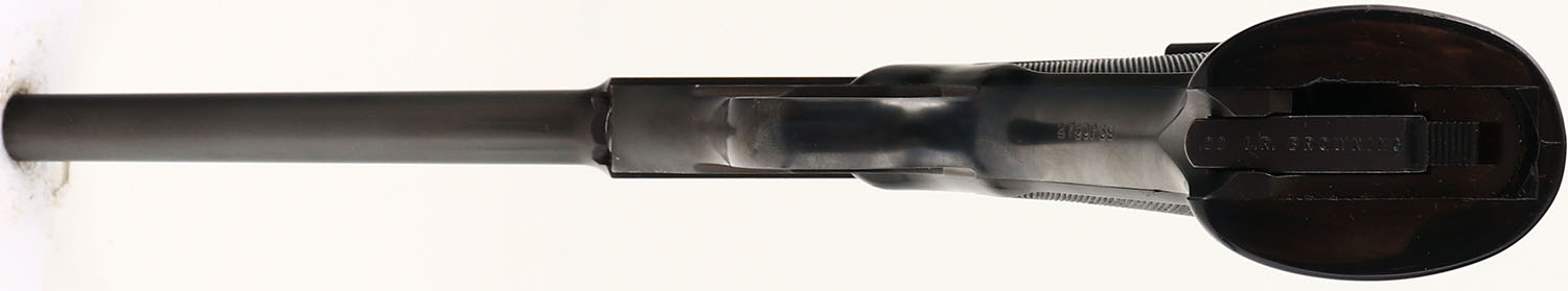 CASED, Browning, Nomad, CAL: 22LR, MFG: 1969, SN: 2750P69, Semi Auto Pistol, 6 3/4'' barrel. The Browning checkered plastic grips are excellent. There are minor scuffs & scrapes. The original metal blue finish rates 97%, with a small area of spotting on the left side of the barrel. Bore is excellent. Adjustable rear sight & ramp elevated serrated blade front sight. Browning factory mag. Comes in original Browning pouch with red interior. FFL or C&R Req. - Value: 400 to 600