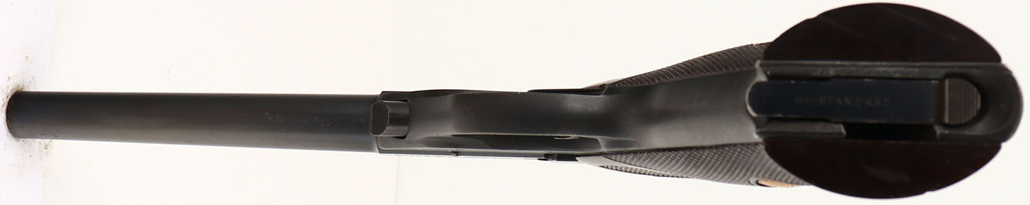 High Standard, Model 103 Sport King, CAL: 22LR, MFG: 1964, SN: 1381835, Semi Auto Pistol, 6 3/4'' barrel. The HS logo medallion checkered plastic grips are very good & solid. There are a few small edge chips on the bottom of the grips, along with minor scuffs & scrapes. The metal blue finish rates 90%, with spotting. Bore is excellent. Fixed rear sight & serrated blade front sight. High Standard factory mag. FFL or C&R Req. - Value: 150 to 300