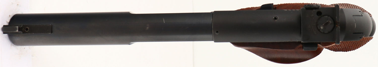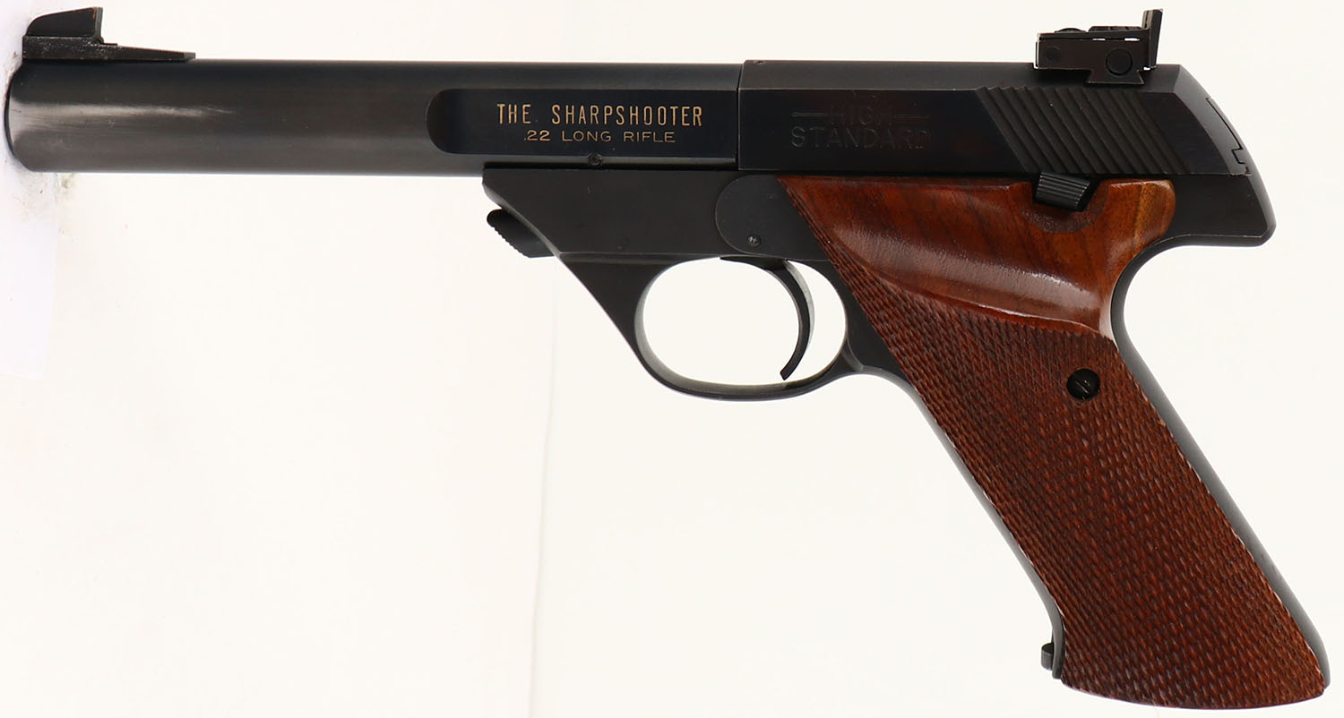 High Standard, The Sharpshooter, CAL: .22LR, MFG: 1948, SN: 2492761, Semi Auto Pistol, 5 1/2'' bull barrel. The checkered wood grips are excellent, with only a couple minor dings. The metal blue finish rates 90% on the barrel, with holster wear & the matte finish on the frame rates 95%. Bore is excellent. Adjustable large rear sight & ramp elevated serrated blade front sight. FFL or C&R Req. - Value: 300 to 450