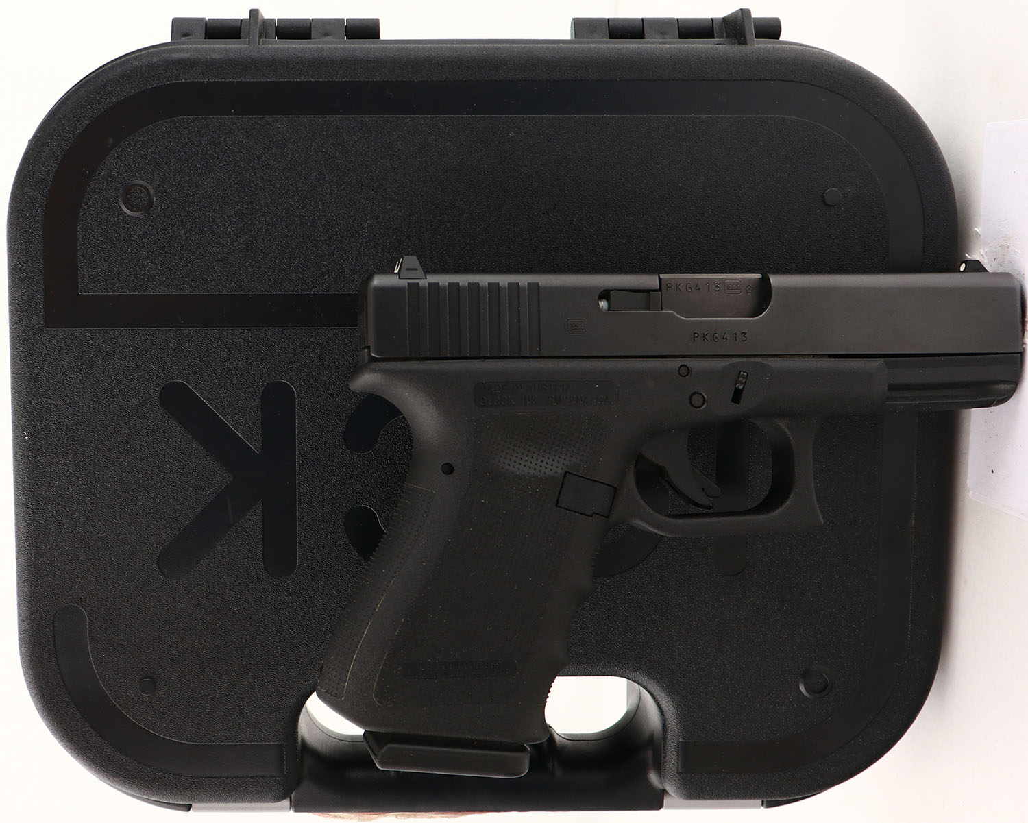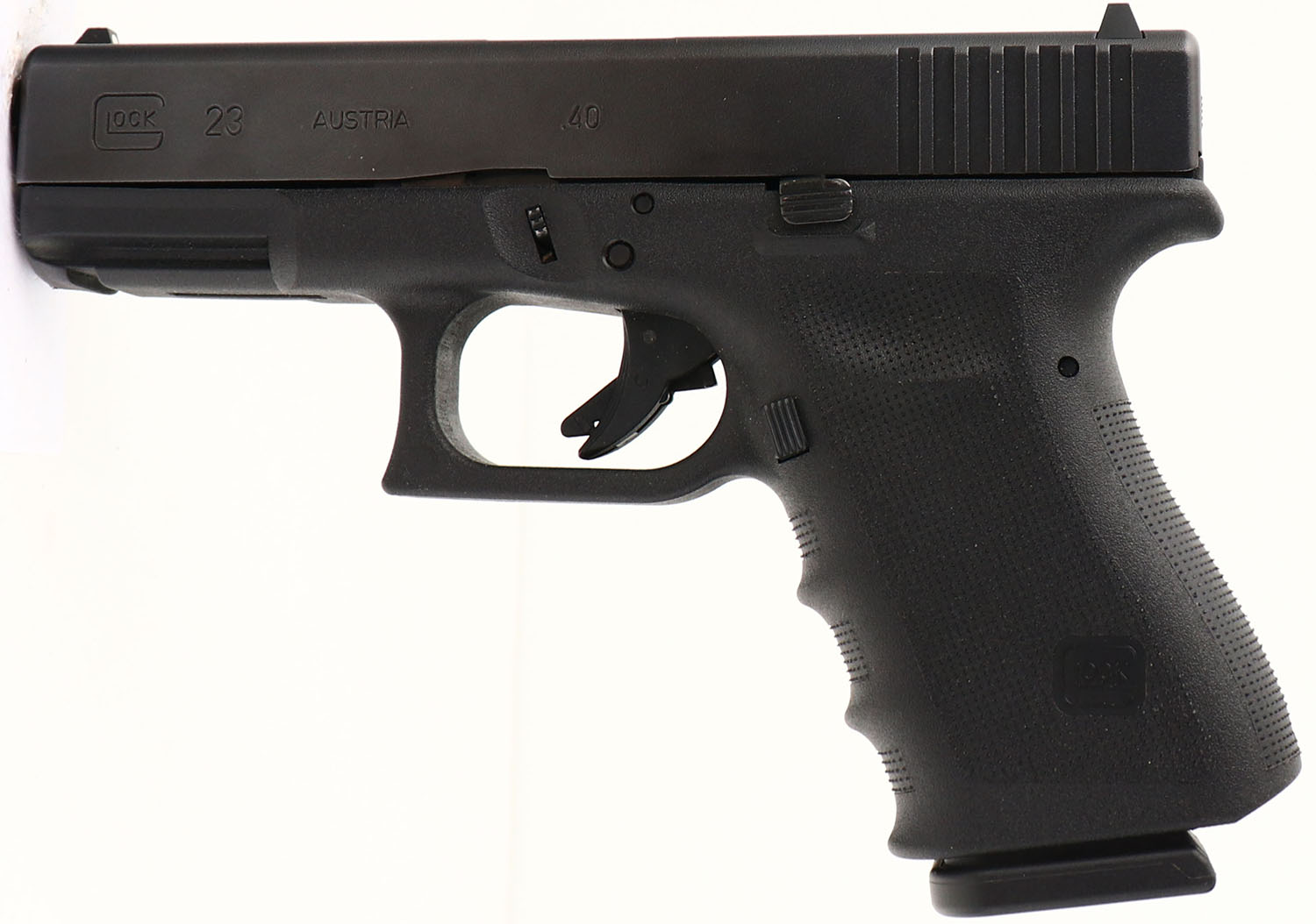 CASED, Glock, Model 23 Gen 3, CAL: 40 S&W, MFG: (Modern), SN:PKG413, Semi Auto Pistol, 3 7/8'' barrel. The factory Glock textured polymer grip frame is excellent. The factory black finish on the slide rates 99% overall. Bore is excellent. The slide holds a white U rear side & a single dot front sight. Comes in factory hard case, with single 13rd mag, cleaning rod, factory test fired rounds & paperwork. FFL Req. - Value: 400 to 800