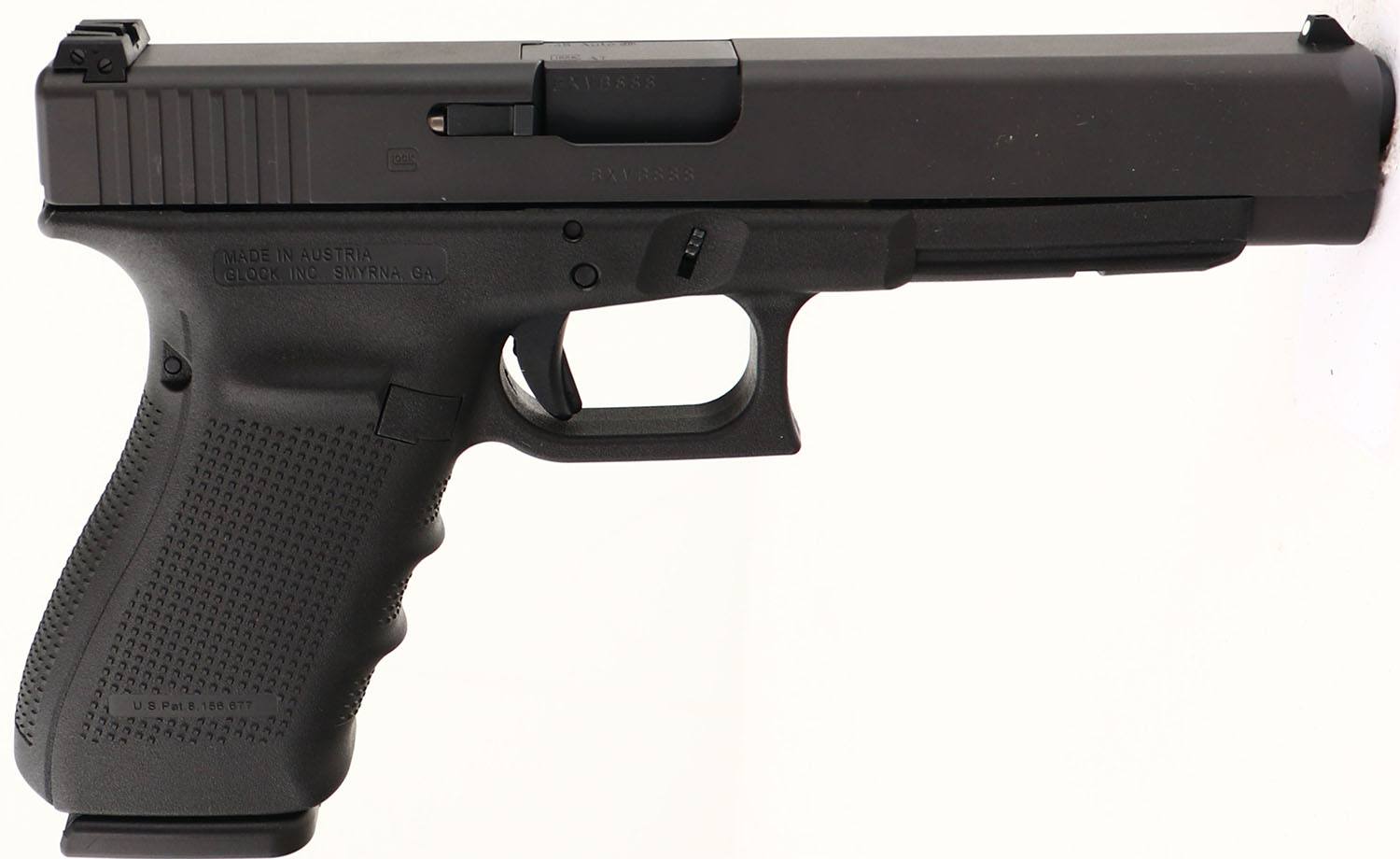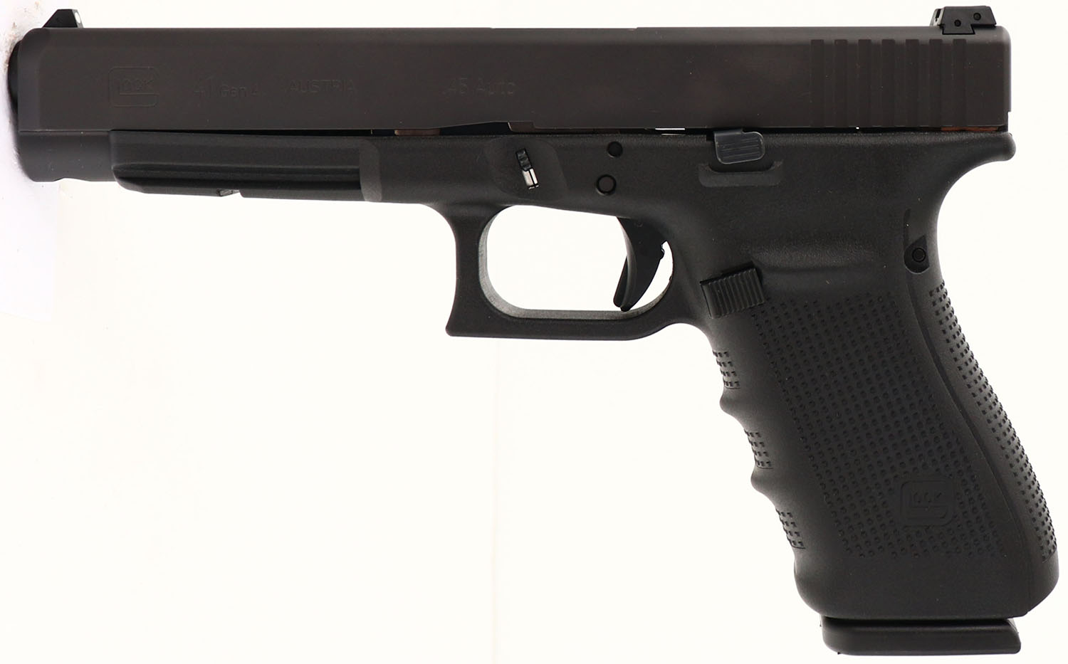 Glock, Model 41 Gen 4, CAL: 45 AUTO, MFG: Modern, SN: BXVB888, Semi Auto Pistol, 5 1/8'' barrel. The Glock textured polymer grip frame is excellent. The matte black finish on the slide rates 99%+. Bore is excellent. Factory contrast sights. FFL Req. - Value: 450 to 700