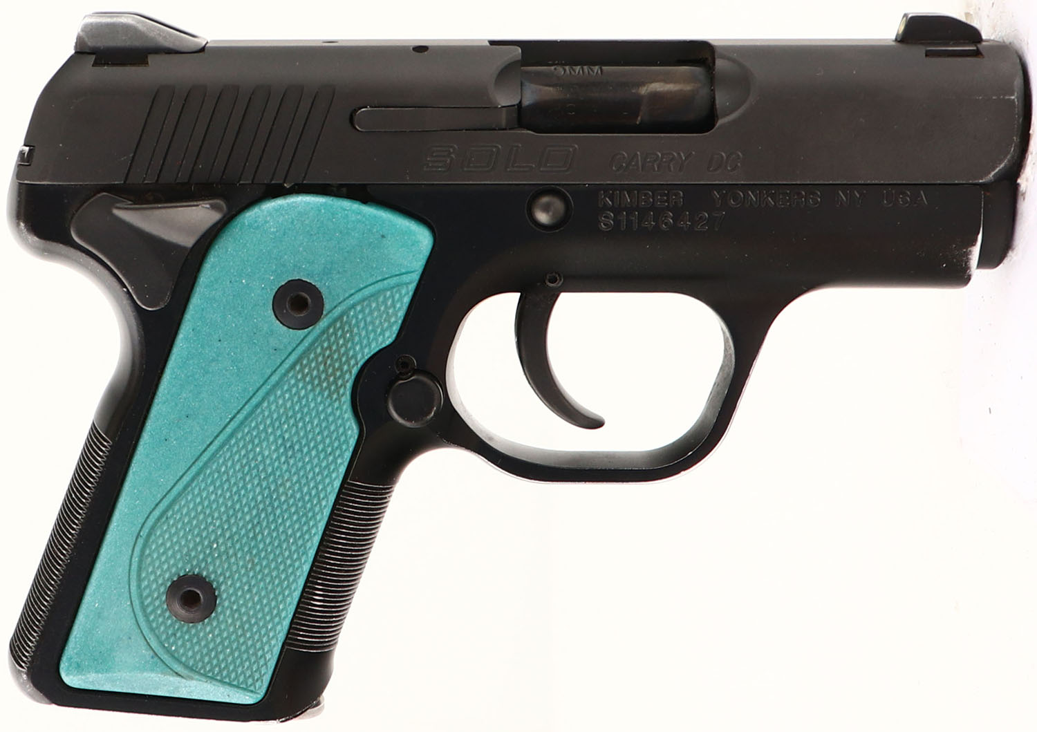 Kimber, Solo Carry DC, CAL: 9mm, MFG: Modern, SN: S1146427, Semi Auto Pistol, 2 3/4'' barrel. The replacement turquoise grips are excellent. There are handling marks & a couple areas of discoloration in the checkering. The matte gray finish on the slide rates 97% & the matte black finish on the frame rates 90%. Bore is excellent, with frosting or haze in the lands & grooves. Serrated front & back strap. A good option for a conceal carry pistol. FFL Req. - Value: 350 to 550