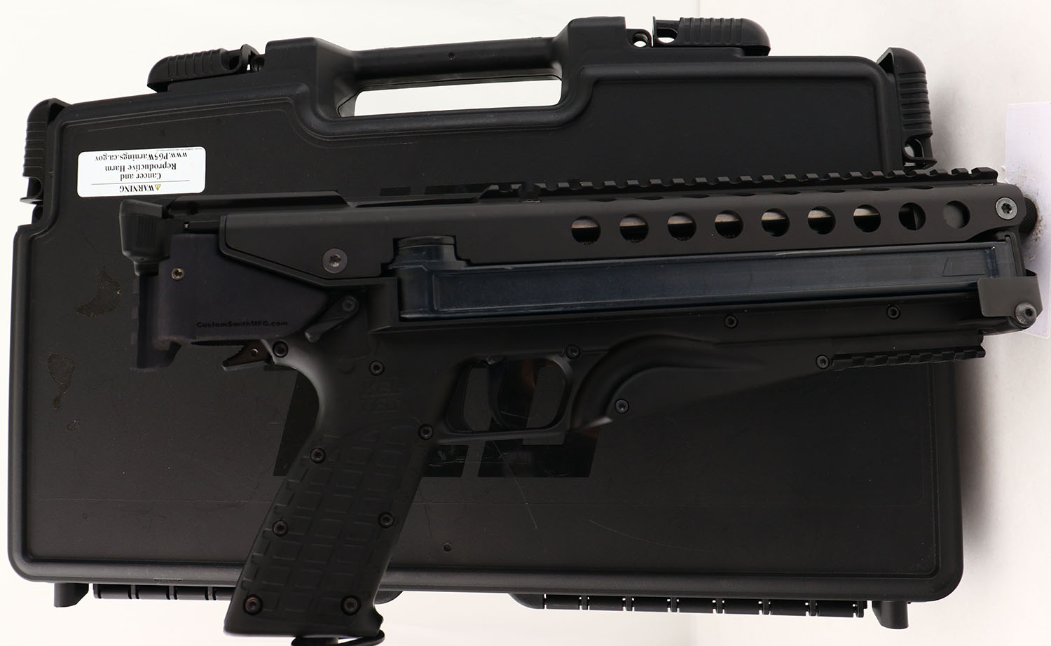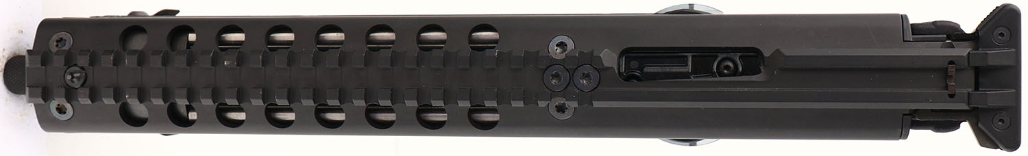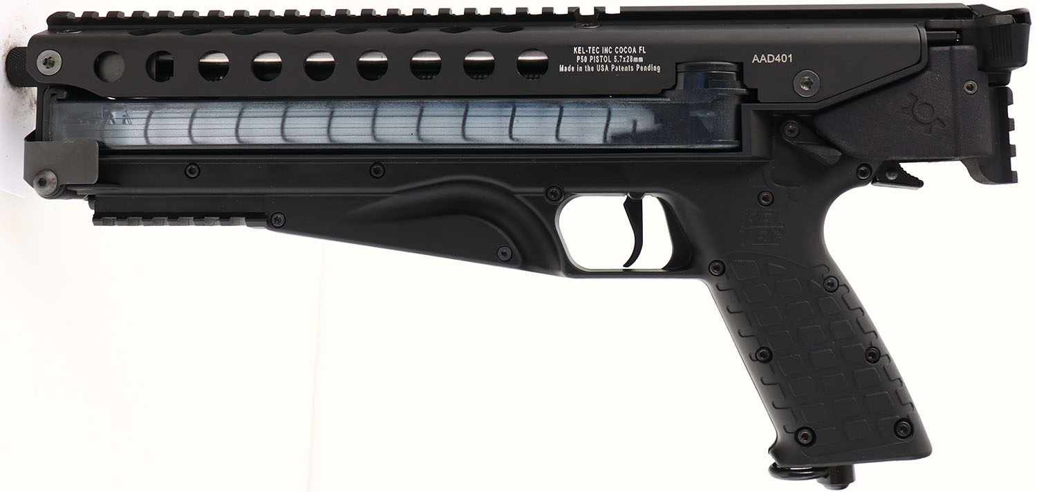 CASED, Kel-Tec, P50, CAL: 5.7x28, MFG: Modern, SN: AAD401, Semi Auto Pistol, 10'' barrel. The synthetic textured grip frame is excellent. The matte black finish on the upper rates 100%. Bore is excellent. Notch & pin front sight. Integrated picatinny rail on the upper, lower & one at the rear for an arm brace/stock. Comes in factory hard case, with trigger lock & sling attachments. FFL Req. - Value: 600 to 800