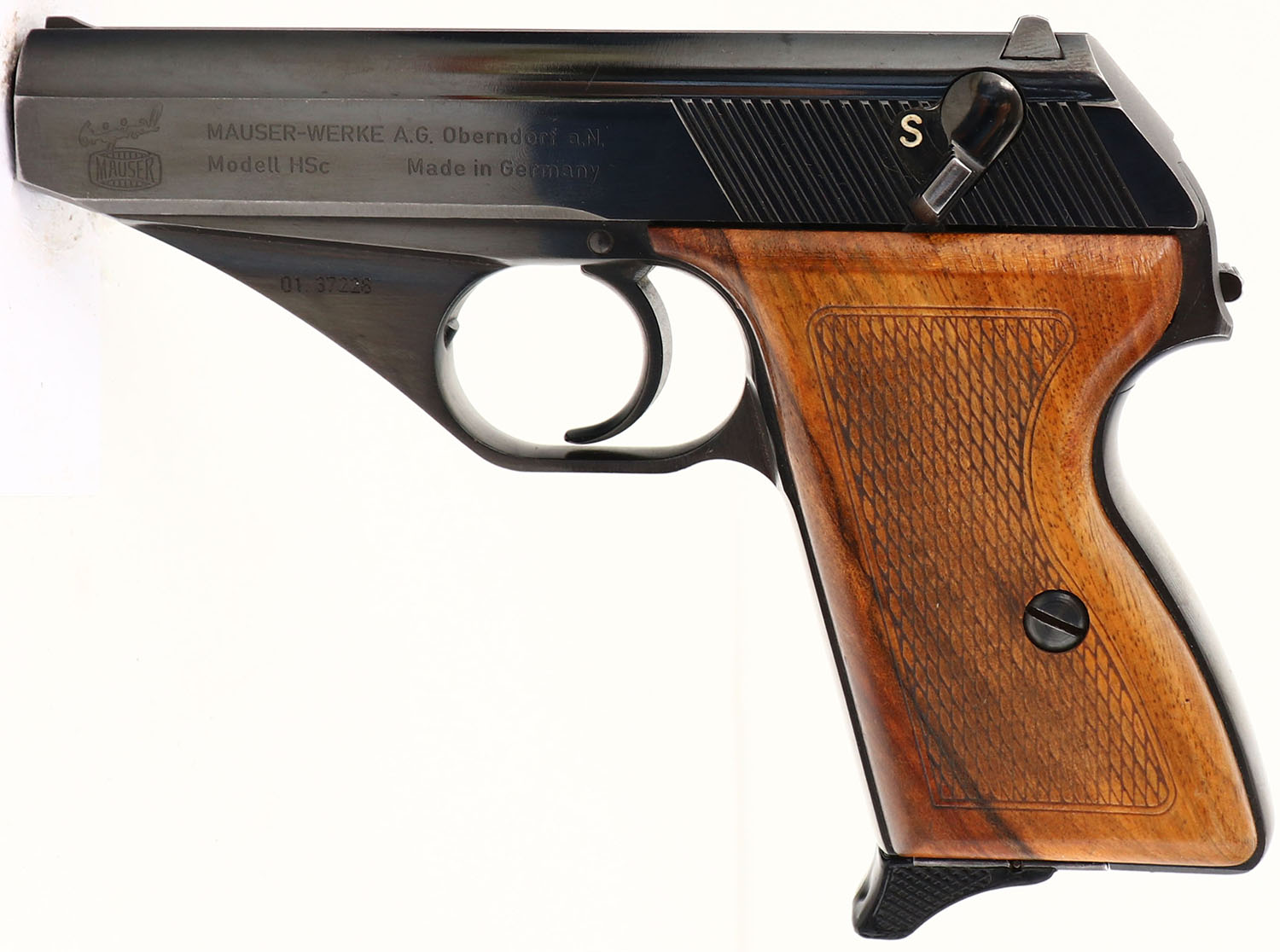 BOXED, Mauser, HSc, CAL: 9mm Kurz (.380 Auto), MFG: 1940-77, SN: 01.37228, Semi Auto Pistol, 3 1/4'' barrel. The checkered wood grips are excellent. The original metal blue finish rates 98% overall. Bore is excellent. Factory fixed sights. Comes in original box with related paperwork. Box condition is very good, with staining on the lid & bottom. FFL Req. - Value: 350 to 550
